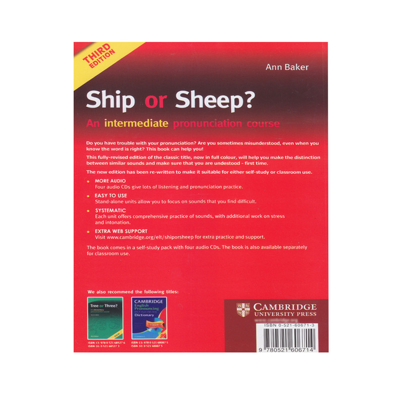 کتاب Ship or Sheep یک کتاب تمرین آواشناسی بسیار لذت بخش است که به زبان آموزان سطح متوسط، تلفظ صحیح کلمات را از همان سطح مبتدی آموزش میدهد؛ تمام صفحات این کتاب،تمام رنگی هستند، و موضوعات کاربردی آن بسیار روان آموزش داده شده است. این کتاب میتواند هم به صورت خودخوان و هم در کلاس درس مورداستفاده قرارگیرد. آموزش استرس و فرازو نشیب در جملات پرسشی و خبری از ویژگی های بارز این کتاب است.این کتاب شامل 50 درس است،که هر درس یک علائم آوایی را تدریس میکند.بخشی از آن علائم آوایی مصوت ها و بخشی دیگر صامت ها را آموزش میدهد. این کتاب،شامل تمارین فوق العاده و بی نظیری است که به کمک آنها،میتوان تمام تلفظ صحیح کلمات را به راحتی دانست و آنها را در خواندن و نوشتن استفاده کرد.