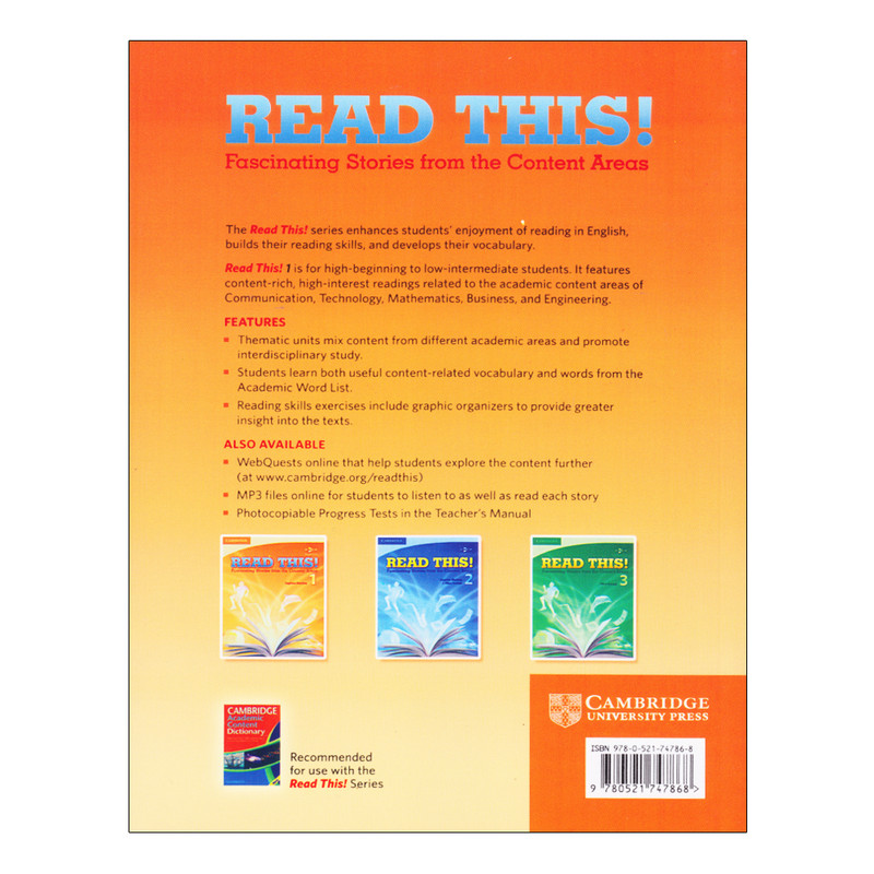کتاب هاي اين مجموعه در چهار سطح (intro, 1, 2, 3) براي گروه سني بزرگسالان از سطح مبتدي تا متوسط براي تقويت مهارت reading با ويژگي هاي content-rich و high-interest با مضامين آکادميک و non-fiction در راستاي تقويت مهارت comprehension، critical thinking، content-specific و general academic vocabulary از مجموعه Academic Word List ارائه مي شود. به منظور درک بهتر متن، واژگان و مهارت هاي reading، تمرين هايي با عنوان pre و post reading activities قبل و بعد از هر متن طراحي شده است. بخش مربوط بهapplying reading skills اطلاعاتي در زمينه تقويت مهارت reading در اختيار داوطلب قرار مي دهد.