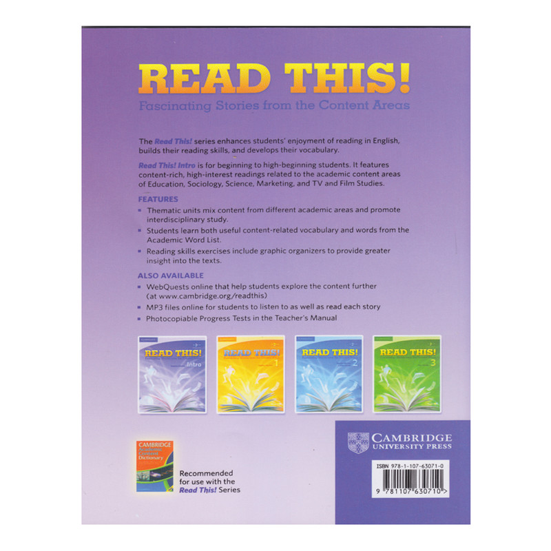 کتاب هاي اين مجموعه در چهار سطح (intro, 1, 2, 3) براي گروه سني بزرگسالان از سطح مبتدي تا متوسط براي تقويت مهارت reading با ويژگي هاي content-rich و high-interest با مضامين آکادميک و non-fiction در راستاي تقويت مهارت comprehension، critical thinking، content-specific و general academic vocabulary از مجموعه Academic Word List ارائه مي شود. به منظور درک بهتر متن، واژگان و مهارت هاي reading، تمرين هايي با عنوان pre و post reading activities قبل و بعد از هر متن طراحي شده است. بخش مربوط بهapplying reading skills اطلاعاتي در زمينه تقويت مهارت reading در اختيار داوطلب قرار مي دهد.