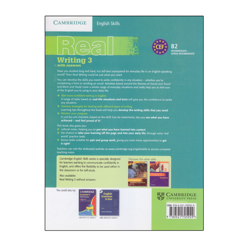 مجموعه Real Writing یک مجموعه 4 سطحی مناسب برای زبان آموزان جوان و بزرگ سال است که در سطوح ابتدایی تا پیشرفته هستند و می خواهند مهارت های نوشتاری خود را تقویت کنند. این کتاب به مهارت نوشتن پرداخته است و از ويژگي اين کتاب ارائه مسائلي که در زندگي روزمره کاربرد دارد مانند در خانه، در محل کار، مسافرت، مطالعه، معاشرت و ... نمونه مثال و تمرين، تمرين هاي تعاملي به صورت گروهي يا دو نفره و آشنايي با افراد بومي از ديگر خصوصيات اين مجموعه است.