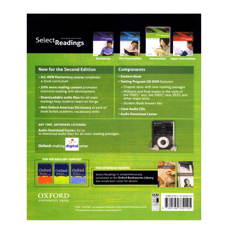 ویرایش دوم سری کتاب های Select Reading یک مجموعه چهار سطحی از انتشارات آکسفورد می باشد که برای تقویت مهارت Reading زبان انگلیسی طراحی شده است. این سری از کتاب ها انتخاب بسیاری از مدرسین زبان انگلیسی بوده است و در مراکز آموزشی متعددی به عنوان یک منبع برای درس زبان عمومی تدریس می شود. هر سطح از این کتاب شامل 14 درس است که در هر درس به بررسی یک موضوع خاص پرداخته شده است. درس ها از بخش های مختلفی تشکیل می شود که با ارائه متن و تمارین متنوع سعی در آموزش Reading و واژگان زبان انگلیسی به شیوه ای جذاب را خواهد داشت. همچنین در CD صوتی این مجموعه فایل های صوتی با لهجه امریکن ارائه گردیده است. - جلد سوم این مجموعه Select Reading - Intermediate شامل یک کتاب و یک CD صوتی می باشد.