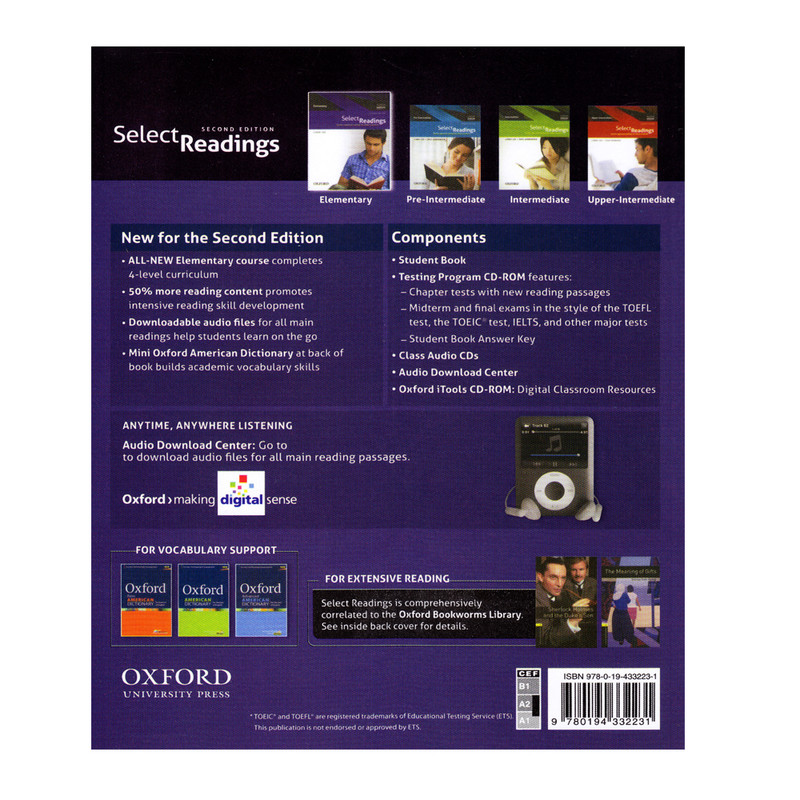 Select Readings مجموعه ای 4 سطحی است که برای تقویت مهارت Reading زبان انگلیسی طراحی شده است. این سری از کتاب ها انتخاب بسیاری از مدرسین زبان انگلیسی بوده است و در اکثر دانشگاهها به عنوان منبعی برای درس زبان عمومی تدریس می شود. ویژگی های مجموعه Select Reading، آموزش مهارت خواندن، درک مطلب و واژگان، تجزیه و تحلیل دستوری، تحریک ذهن، بحث وگفتگو و است. زبانآموزان مقالات جالب و متنوعی را در زمینههای گوناگون در این کتاب ها خواهند یافت. در این کتاب با طیف گستردهای از موضوعات مواجه خواهید شد که به طور همزمان با بسیاری از لغات و کلمات جدید آن را نیز فرا خواهید گرفت. در این پست هر چهار سطح این مجموعه از (Elementary, Pre Intermediate, Intermediate, Upper Intermediate) در اختیار زبان آموزان قرار گرفته است.