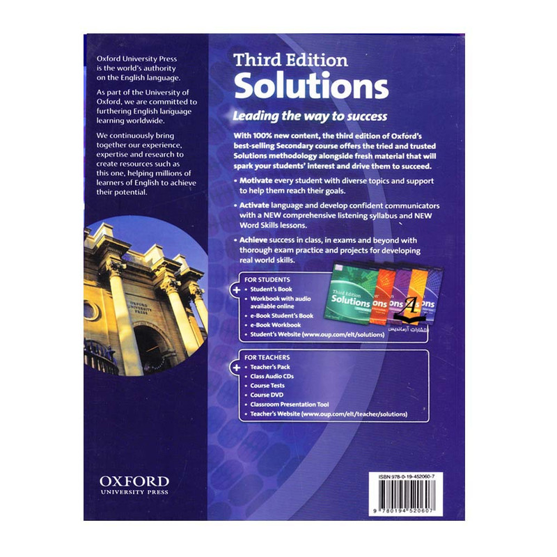 مجموعه آموزش زبان انگلیسی Solutions ویرایش سوم یکی از بهترین مجموعه های آموزش زبان انگلیسی است که برای گروه نوجوانان تنظیم شده است. شبیه ویرایش های قبلی ویرایش سوم حاوی محتواهای جذاب و دوست داشتنی است. تمرکز ویرایش سوم این مجموعه بر مهارت شنیداری زبان آموزان و دانش واژگان می باشد. یک منبع جامع و بسیار مهم متمرکز بر آموزش اساسی واژگان، دستور زبان، خواندن، صحبت کردن و نوشتن، همه و همه با بهره گیری از محتوای 100٪ به روز در زمینه مهارت شنیداری و مهارت های واژگانی که به توسعه و تقویت مهارت های ارتباطی و آزمون می پردازد. نه فصل در کتاب گنجانده شده که هر فصل نیز شامل هشت درس می شود. این کتاب به زبان اموزان روش ها، راهبردها و مهارت های آزمون که برای دستیابی به موفقیت لازم دارند را در چارچوبی دقیق و جامع فراهم می کند.