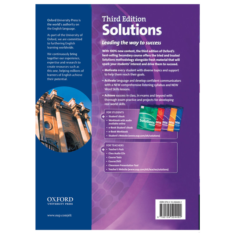 مجموعه آموزش زبان انگلیسی Solutions ویرایش سوم یکی از بهترین مجموعه‌های آموزش زبان انگلیسی است که برای گروه نوجوانان تنظیم شده است. شبیه ویرایش‌های قبلی ویرایش سوم حاوی محتواهای جذاب و دوست‌داشتنی است. تمرکز ویرایش سوم این مجموعه بر مهارت شنیداری زبان‌آموزان و دانش‌واژگان می‌باشد. یک منبع جامع و بسیار مهم متمرکز بر آموزش اساسی واژگان، دستور زبان، خواندن، صحبت کردن و نوشتن، همه و همه با بهره‌گیری ا...
