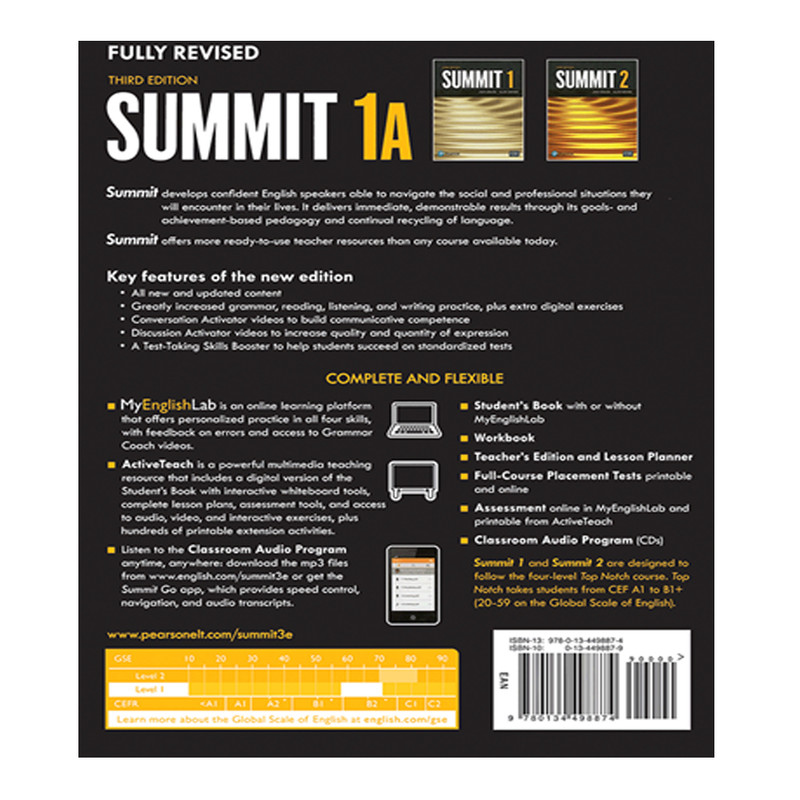 ویرایش سوم مجموعه Summit مجموعه ای دو سطحی است که معمولا به عنوان دوره تکمیلی و پیشرفته تر برای مجموعه Top Notch در نظر گرفته می شود و مباحث زبان انگلیسی را در سطح بالاتری به زبان آموزان آموزش می دهد. این مجموعه که از سوی انتشارات Pearson به چاپ رسیده است و در دور سطح تقسیم شده است و هر یک از سطوح به دو بخش A و B تقسیم گردیده است. مباحث این کتاب را را می توان در دسته بندی های پیشرفته تر در نظر گرفت. که معمولا پس از طی دوره تاپ ناچ مورد تدریس قرار می گیرد. این مجموعه را می توان یکی از برترین منابع آموزشی تکمیلی دانست که پس لز طی آن زبلن آموز می تواند خود را برای آزمون های آکادمیک از جمله آیلتس و تافل آماده سازد. در این بخش کتاب های دانش آموز، کتاب تمرین و فایل های صوتی ویرایش سوم کتاب های Summit برای دانلود در اختیار زبان آموز قرار گرفته شده است. هر کتاب شامل دو بخش A , B می باشد که در 5 درس به صورت تفصیلی مورد بررسی و تدریس قرار گرفته شده است. مجموعه کتاب های تاپ ناچ و سامیت یکی از منابع مهمی است که در حال حاضر در بسیاری از آموزشگاههای زبان مورد تدریس قرار می گیرد