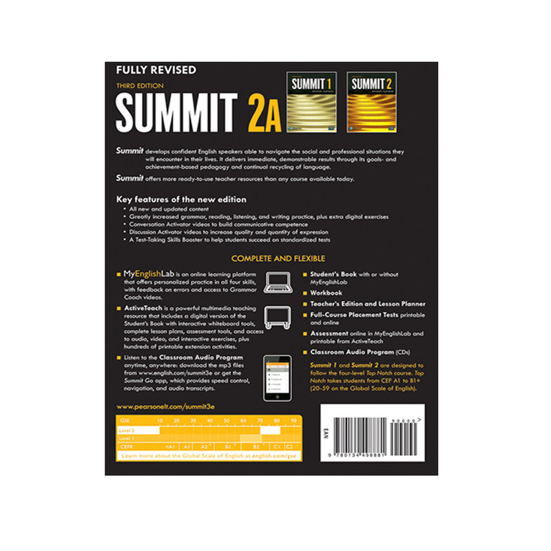 ویرایش سوم مجموعه Summit مجموعه ای دو سطحی است که معمولا به عنوان دوره تکمیلی و پیشرفته تر برای مجموعه Top Notch در نظر گرفته می شود و مباحث زبان انگلیسی را در سطح بالاتری به زبان آموزان آموزش می دهد. این مجموعه که از سوی انتشارات Pearson به چاپ رسیده است و در دور سطح تقسیم شده است و هر یک از سطوح به دو بخش A و B تقسیم گردیده است. مباحث این کتاب را را می توان در دسته بندی های پیشرفته تر در نظر گرفت. که معمولا پس از طی دوره تاپ ناچ مورد تدریس قرار می گیرد. این مجموعه را می توان یکی از برترین منابع آموزشی تکمیلی دانست که پس لز طی آن زبلن آموز می تواند خود را برای آزمون های آکادمیک از جمله آیلتس و تافل آماده سازد. در این بخش کتاب های دانش آموز، کتاب تمرین و فایل های صوتی ویرایش سوم کتاب های Summit برای دانلود در اختیار زبان آموز قرار گرفته شده است. هر کتاب شامل دو بخش A , B می باشد که در 5 درس به صورت تفصیلی مورد بررسی و تدریس قرار گرفته شده است. مجموعه کتاب های تاپ ناچ و سامیت یکی از منابع مهمی است که در حال حاضر در بسیاری از آموزشگاههای زبان مورد تدریس قرار می گیرد