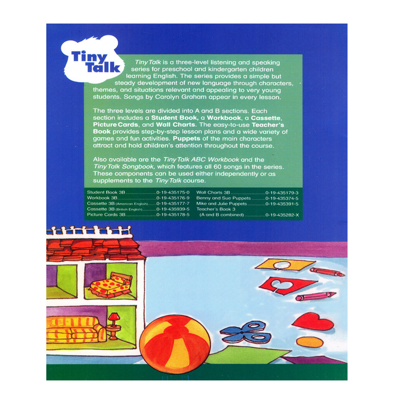 شاید بتوان مجموعه Tiny Talk را یکی از مقدماتی ترین آموزش های زبان انگلیسی دانست. این مجموعه با تصاویر جذاب و به شیوه ساده زبان انگلیسی را به همراه فایل صوتی به زبان آموزان خردسال 3 تا 6 سال آموزش می دهد. این مجوعه در سه سطح تنظیم شده است که هر سطح به دو بخش A و B تقسیم می شود هر کتاب شامل 10 درس است که به موضوعات ساده و روزمره می پردازد. والدین می توانند در کنار دانش آموز به تمرین و کمک به یادگیری بهتر این مجموعه بپردازند.همچنین در سطح یک این مجموعه یک کتاب الفبا ارائه شده تا زبان آموز ابتدا با حروف زبان انگلیسی آشنا شده و سپس به یادگیری دروس بپردازند.