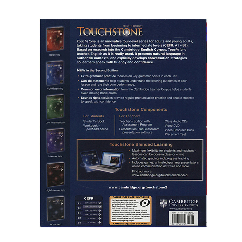 مجموعه Touchstone ویرایش دوم یک مجموعه آموزشی کامل مخصوص بزرگسالان است که در چهار سطح توسط نام دارترین نویسندگان حوزه آموزش زبان Michael McCarthy، Jeanne McCarten و Helen Sandiford تالیف و در انتشارات کمبریج به چاپ رسیده است. استراتژی مکالمات این کتاب بر مبنای عبارت پرتکرار، کاربردی و رایج در زبان انگلیسی بنا شده است . به همین دلیل شما بعد از پایان هر سطح به راحتی و با اعتماد به نفس می توانید درباره موضوعات روزمره کاملا روان و مسلط صحبت کنید. از طرفی وجود ابزارهای چند رسانه ای این مجموعه مانند نرم افزار خودآموز، فایل های ویدئویی و صوتی نه تنها جذابیت یادگیری را افزایش می دهد بلکه طیف وسیعی از محتوای آموزشی غنی و کاربردی را در اختیارتان قرار می دهد.