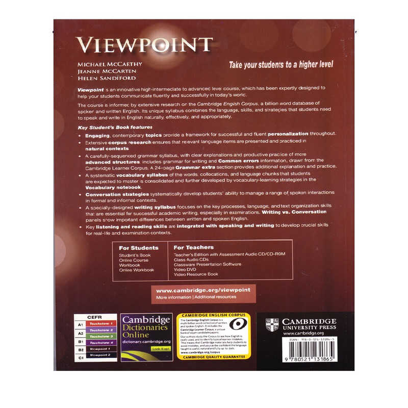 دوره آموزش زبان View Point، چاپ انتشارت کمبریج می باشد و مجموعه ای کامل برای آموزش زبان انگلیسی به بزرگسالان و نوجوانان در سطح متوسط تا پیشرفته (B2-C1) است. این انتشارات چهار سطح اصلی با عنوان Touchstone و دو سطح در سطوح پیشرفته تر با نام View Point منتشر نموده است که به عنوان مرجع تدریس در بسیاری از آموزشگاههای داخل و خارج از کشور مورد استفاده قرار می گیرد. هر سطح از این سری کتاب ها شامل 12 درس می باشد که موضوعات متنوعی در تمامی مهارت ها را به زبان آموز آموزش خواهد داد. براساس تحقیقات و بررسی های صورت گرفته از سوی دانشگاه کمبریج تاچ استون و ویو پوینت تا حد امکان زبان انگلیسی واقعی در زندگی روزمره را آموزش می دهد. این دوره به زبان آموز کمک می کند تا دانش مکالمه خود را تقویت ساخته تا از اعتماد به نفس بیشتری برخوردار شود. تاچ استون گرامر، واژگان، و استراتژی های مکالمه را برای برطرف ساختن نیازهای زبان آموز در زندگی مدرن امروزی آموزش می دهد .