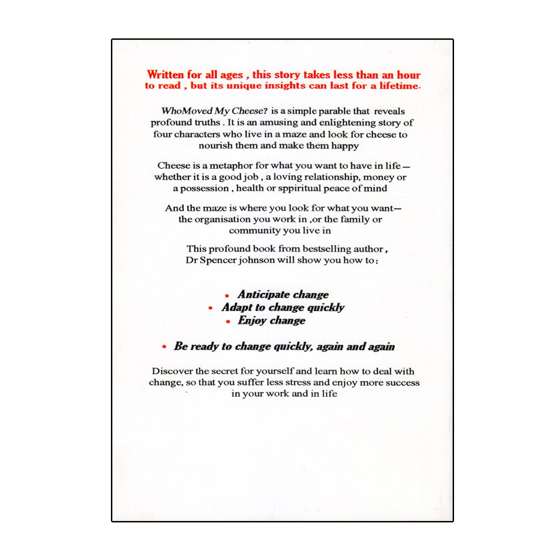 کتاب کلاسیک و جاودانه چه کسی پنیر مرا جابجا کرد؟ با استفاده از داستان های آموزنده، ساده و بر گرفته از زندگی واقعی به شما می اموزد که چه طور با تغییرات و دگرگونی های زندگی رو به رو شوید و در شرایط دشوار تصمیم درستی اتخاذ کنید. همچنین، شما خواهید اموخت که چطور باید برای خروج از هزارتوی مشکلات زندگی زمان و ذهن خود را مدیریت کرده و به موفقیت در زندگی شخصی و حرفهای خود دست یابید.