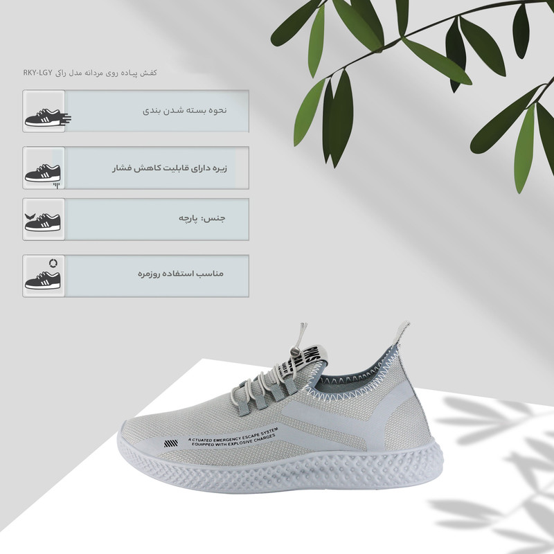 کفش مردانه یک کفش راحتی برای استفاده روزمره و پیادهروی به شمار می آید. اکثر افراد برای راحتی بیشتر پا، به دنبال محصولی سبک و راحت هستند تا در طول روز احساس خستگی کمتری داشته باشند. کفش راکی RKY-LGRY از به روز ترین تکنولوژی روز صنعت کفش تهیه شده است. در رویه این کفش از پارچه با کیفیت استفاده شده است. کفی آن از جنس پی او نرم است که موجب کاهش فشار وارده بر پا می شود. کفه این محصول با استفاده از دستگاهای تمام اتوماتیک به رویه آن وصل شده به طوری که رویه و کفه کاملا یکپارچه است و قابل شستشو است. این کفش از نوع بندی است اما به راحتی و در کوتاه ترین زمان قابل تنظیم است. این کفش راحتی حالت اسپرت دارد که به سادگی با اکثر شلوارها مانند: جین، کتان و ... قابل ست کردن است. این کفش با توجه به طراحی درخشان و کیفیت بالا از محصولات صادراتی به حساب می آید که علاوه بر سبکی و راحتی دارای طول عمر زیادی می باشد. اگر به دنبال کفشی با ظاهر اسپرت و راحت هستید این محصول می تواند گزینه خوبی برای شما باشد.نکته قابل توجه این کفش ضد آب بودن آن است.