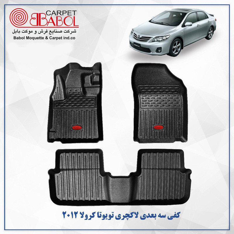 کفپوش سه بعدی لاکچری خودرو کرولا 2012 _ کفپوش سه بعدی خودرو بابل کارپت مدل لاکچری از جنس پلیمر بسیار نرم و انعطاف پذیر , کاملا از مواد نو و بدون هیچگونه بوی نا مطبوع تولید شده است دور بری آن به وسیله دستگاه واترجت بسیار با دقت انجام شده است و هیچگونه زائده اضافی ندارد و همچنین مثل سایر محصولات شرکت بابل کارپت دیگر پشت آن نمدی نمی باشد و شستوشوی بسیار آسانی دارد. مهترین ویژگی و مزیت کفپوش مدل لاکچری نسبت به سایر اجناس موجود در بازار نرمی و انعطاف بسیار بالای آن می باشد که باعث سهولت در جایگذاری و بیرون آوردن آن از داخل خودرو میشود. لطفا کفپوش های فابریک خودرو را خارج کنید تا برای کفپوش سه بعدی مزاحمت ایجاد نشود/