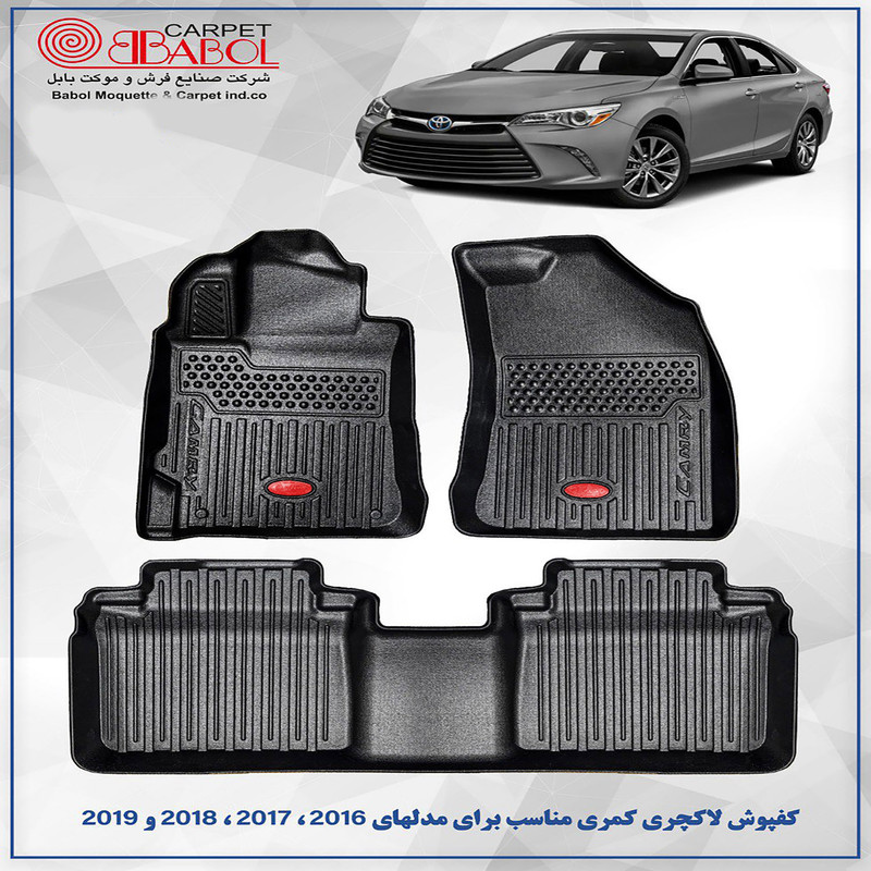 کفپوش سه بعدی لاکچری خودرو تویوتا کمری مناسب مدلهای 2016/2017/2018/2019_ کفپوش سه بعدی خودرو بابل کارپت مدل لاکچری از جنس پلیمر بسیار نرم و انعطاف پذیر , کاملا از مواد نو و بدون هیچگونه بوی نا مطبوع تولید شده است دور بری آن به وسیله دستگاه واترجت بسیار با دقت انجام شده است و هیچگونه زائده اضافی ندارد و همچنین مثل سایر محصولات شرکت بابل کارپت دیگر پشت آن نمدی نمی باشد و شستوشوی بسیار آسانی دارد. مهترین ویژگی و مزیت کفپوش مدل لاکچری نسبت به سایر اجناس موجود در بازار نرمی و انعطاف بسیار بالای آن می باشد که باعث سهولت در جایگذاری و بیرون آوردن آن از داخل خودرو میشود. لطفا کفپوش های فابریک خودرو را خارج کنید تا برای کفپوش سه بعدی مزاحمت ایجاد نشود/