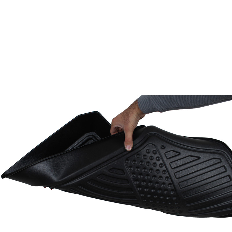 محصول فوق کفپوش سه بعدی اتاق به همراه کفپوش صندوق خودروی فرداموتورز FMCT5 میباشد و رنگ بندی درج شده در ان مربوط به کفپوش اتاق میباشد و کفپوش صندوق تنها به صورت رنگ مشکی میباشد . کفپوش سه بعدی خودرو بابل کارپت مدل لاکچری از جنس پلیمر بسیار نرم و انعطاف پذیر , کاملا از مواد نو و بدون هیچگونه بوی نا مطبوع تولید شده است دور بری آن به وسیله دستگاه واترجت بسیار با دقت انجام شده است و هیچگونه زائده اضافی ندارد و همچنین مثل سایر محصولات شرکت بابل کارپت دیگر پشت آن نمدی نمی باشد و شستوشوی بسیار آسانی دارد. مهترین ویژگی و مزیت کفپوش مدل لاکچری نسبت به سایر اجناس موجود در بازار نرمی و انعطاف بسیار بالای آن می باشد که باعث سهولت در جایگذاری و بیرون آوردن آن از داخل خودرو میشود.همچنین محل گیره ها برای کفی سمت راننده ایجاد شده است تا از لیز خوردن ان جلو گیری کند.