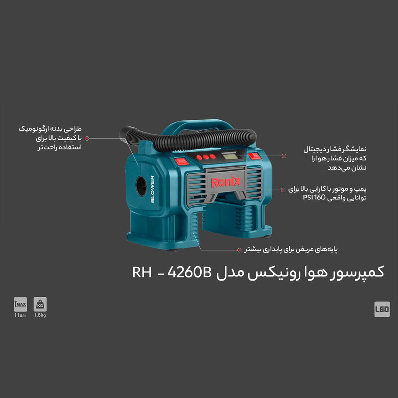 سایر توضیحات | - مجهز به سیلندر مستحکم جهت تولید هوا با قدرت PSI 160 جهت - باد کردن انواع لاستیک خودروهای سواری - دارای قابلیت دمندگی برای استفاده به عنوان بلوور به کمک شلنگ - خرطومی تعبیه شده بر روی دستگاه - دارای صفحه نمایش دیجیتال جهت نمایش میزان فشار تولیدی - دارای مکانیزم تنظیم شونده قطع کننده در فشار مطلوب جهت سهولت کاربری - دارای پایه های پهن جهت افزایش پایداری دستگاه - تعبیه محل قرارگیری سیم تغذیه درون پوسته جهت سهولت کاربری - دارای سری های کاربردی جهت استفاده در فضاهای گوناگون - طراحی منحصر به فرد محل قرار گیری سری ها و شلنگ باد - بدنه با کیفیت و ساختار ارگونومیک جهت افزایش زیبایی و کیفیت عملکرد - دارای سری فندکی فیوز دار و سیم تغذیه بلند جهت افزایش اثر بخشی و تعبیه لامپ بر روی سری فندک - دارای چراغ LED پر نور جهت مصارف روشنایی به عنوان چراغ قوه به همراه کیف برزنتی با کیفیت مدل (RH-4260B) - تامین انرژی از طریق برق 12 ولت (فندکی خودرو) - قابلیت استفاده بهصورت دستگاه دمنده با خروجی جدا - قابلیت استفاده بهعنوان کمپرسور با خروجی مجزا - نمایش فشار برحسب واحدهای بار، پی اس آی و کیلو پاسکال - دارای نمایشگر دیجیتال - قابلیت تنظیم فشار باد خروجی از دستگاه - دارای 3 لامپ ال ای دی جهت استفاده از دستگاه بهعنوان چراغ قوه - دارای 3 نازل جهت اتصال به تجهیزات مختلف - دارای کابل فندکی 3 متری - دارای پایهای با قابلیت جذب لرزش |