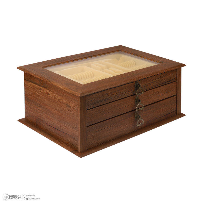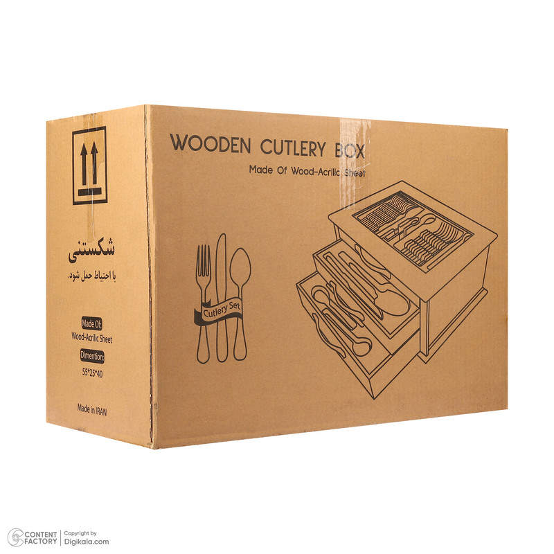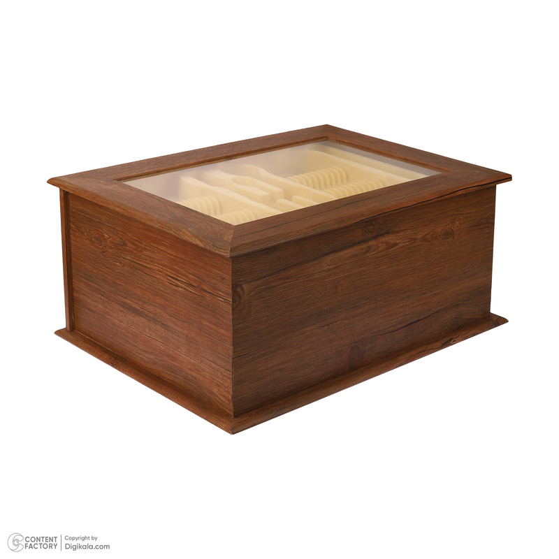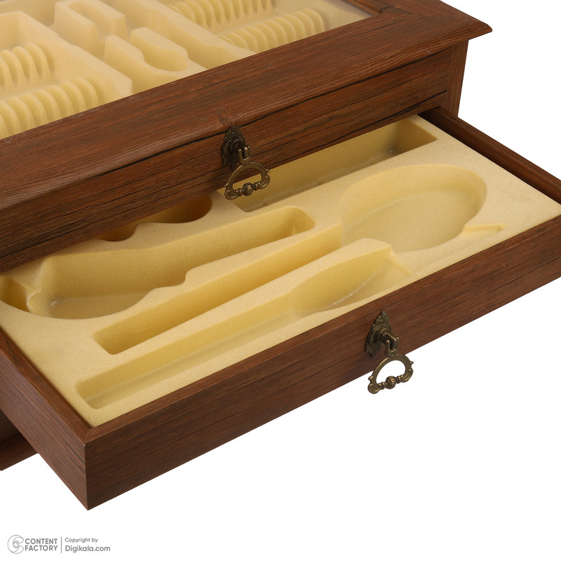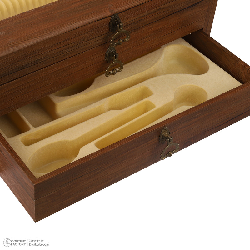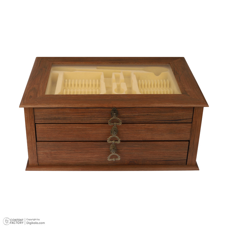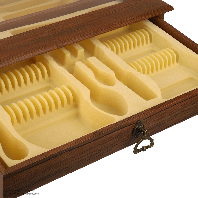 کنسول قاشق چنگال چوبی سه کشو می باشد.که از بهترین نوع روکش با خطوط الهام گرفته از رده های چوب طبیعی طراحی و ساخته شده است. کیفیت ساخت کنسول چوبی تراز اول کیفی را دارا می باشد و جزو لوکس ترین های بازار کشور می باشد. وجه بالایی کنسول از چوب و شیشه ساخته شده که به زیبایی بیش تر این طراحی افزوده است.کنسول مخصوص چیدمان سرویس قاشق و چنگال یکی از زیباترین و منحصرد بفرد ترین کنسول هایی است که میتوانید برای لوازم خانه خود استفاده کنید. کنسول قاشق و چنگال چوبی همراه با فوم ارائه میشود. داشتن فوم در کنسول نکته بسیار قابل ملاحضه است که باید در هنگام خرید به آن توجه شود که برای چیدمان منظم ظروریست.این کنسول برای سرویس های119تا158 پارچه قابل استفاده میباشد.