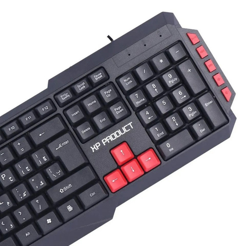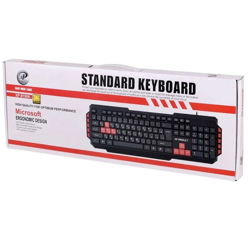 روف، اعداد و علامتهایی که روی کلیدهای کیبورد XP-8100K حک شدهاند، کاملا بزرگ و شفاف هستند تا به راحتی قابل خواندن باشند و نیازی به دقت زیاد در هنگام استفاده از آن نباشد.این کیبورد کاملا ساده و کاربردی طراحی شده و به دلیل بهرهبری از کلیدهای استاندارد و بسیار نرمی که به ندرت صدایی از خود ایجاد میکنند، قابلیت یک تایپ بسیار نرم، روان و تقریبا بیصدا را برای شما به ارمغان میآورد.این کیبورد دارای پایههای خم شونده نیز میباشد که قابل تنظیم ارتفاع را به شما میدهند. این کیبورد از طریق پورت USB به کامپیوتر شما متصل می شود و نیاز به نصب هیچگونه نرم افزاری ندارد . ضد آب بودن نیز یکی دیگر از ویژگی های این کیبورد وجود حفره در پشت خود می باشد که مایعات و آب را از خود عبور می دهد.