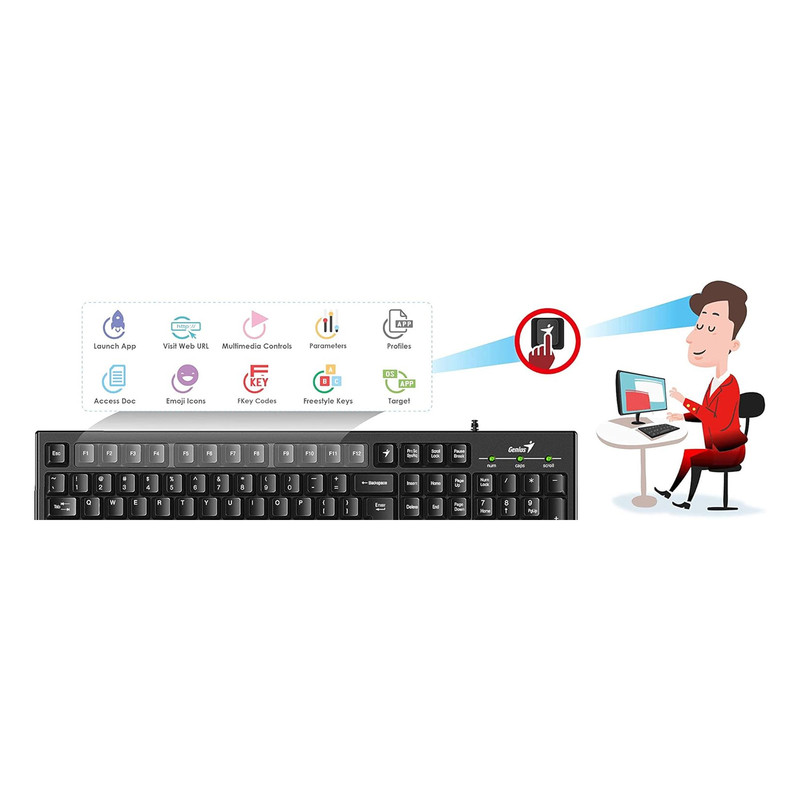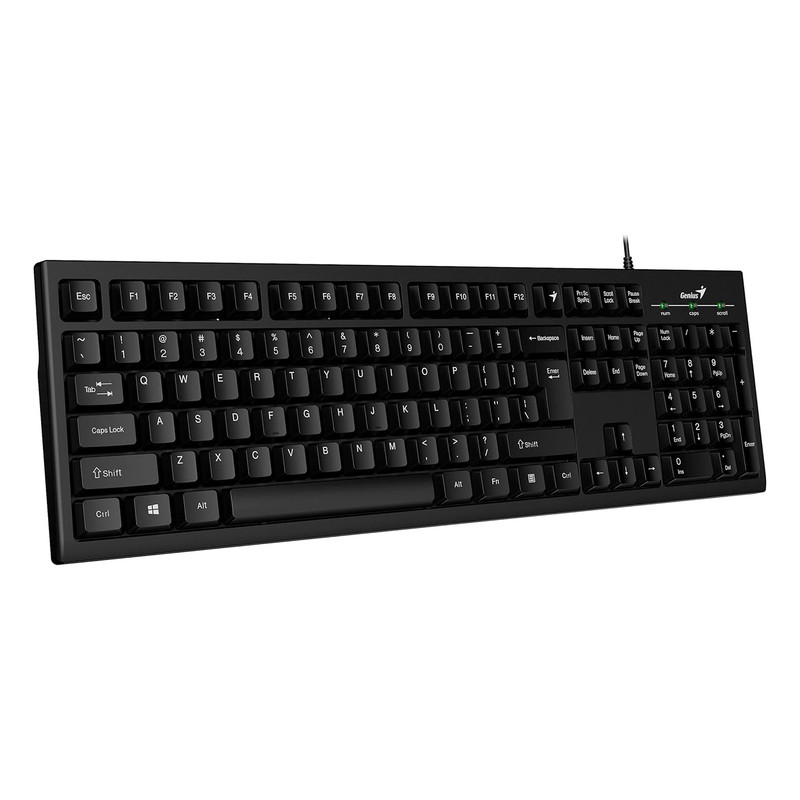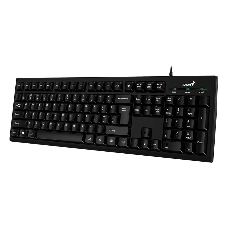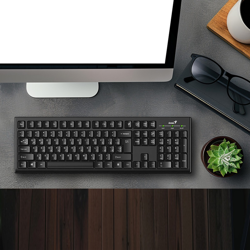 کیبورد جنیوس مدل Smart KB-100 یک صفحه‌کلید باسیم با طراحی فول‌سایز است که برای استفاده‌های اداری و خانگی عرضه شده است. این محصول با ابعاد ۴۴۰.۵۱ در ۱۳۹.۶۷ در ۲۰.۰۷ میلی‌متر و وزن ۴۵۰ گرم، حجمی مناسب داشته و به‌واسطه سوییچ‌های ممبران با صدای کم و حس نرم، تجربه‌ای راحت برای تایپ فراهم می‌کند. بدنه پلاستیکی، وزن سبک و مقاومت نسبی در برابر فشارهای روزمره را تضمین می‌کند.
