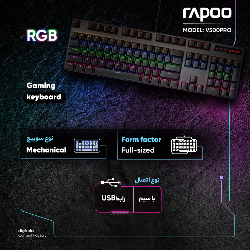 این روزها استفاده از لوازم کامپیوتری تقریباً برای اکثر افراد تبدیل به امری روزمره و اجتنابناپذیر شده است. کامپیوترها نقش غیرقابلانکاری را در زندگی شخصی و کاری ما انسانها به عهده دارند. این موضوع سبب شده انتخاب و استفاده از لوازم کامپیوتری باکیفیت، خوشساخت و مقاوم از اهمیت زیادی برخوردار باشد. بدیهی است یکی از متعلقات کامپیوتر که کاربر بیشترین استفاده را بهصورت مستقیم از آن انجام میدهد کیبورد است و شاید ساعتها در روز دستان شما روی صفحه کیبورد قرار بگیرد. محصول «V500PRO» یکی از کیبوردهای کاربردی و خوشساخت ارائهشده به بازار توسط شرکت «رپو» (Rapoo) است. این کیبورد مخصوص بازی در دستهی کیبوردهای سیمدار قرار میگیرد و از طریق اتصال USB به کامپیوتر وصل میشود. این کیبورد گیمینگ از تعداد 104 کلید برخوردار است. مهمترین ویژگی V500PRO کلیدهای مکانیکی آن است که سرعت پاسخدهی بالایی را برای آن به همراه آورده است. این ویژگی به گیمر این اجازه را میدهد تا بتواند با خیال راحتتری بازی کند و دیگر نگران این نباشد که در هنگام فشردن همزمان چند کلید، یک یا چند عدد از آنها در بازی ثبت نشوند. نور پسزمینه قابل تنظیم و ظاهری شیک از دیگر ویژگیهای این محصول هستند که هم میتوانند تداعیگر یک صفحهکلید گیمینگ و هم نمایانگر یک صفحهکلید بسیار مناسب مخصوص کارهای روزانه باشند.