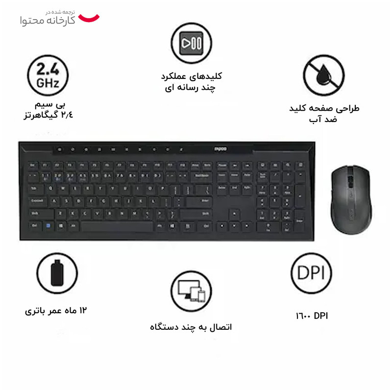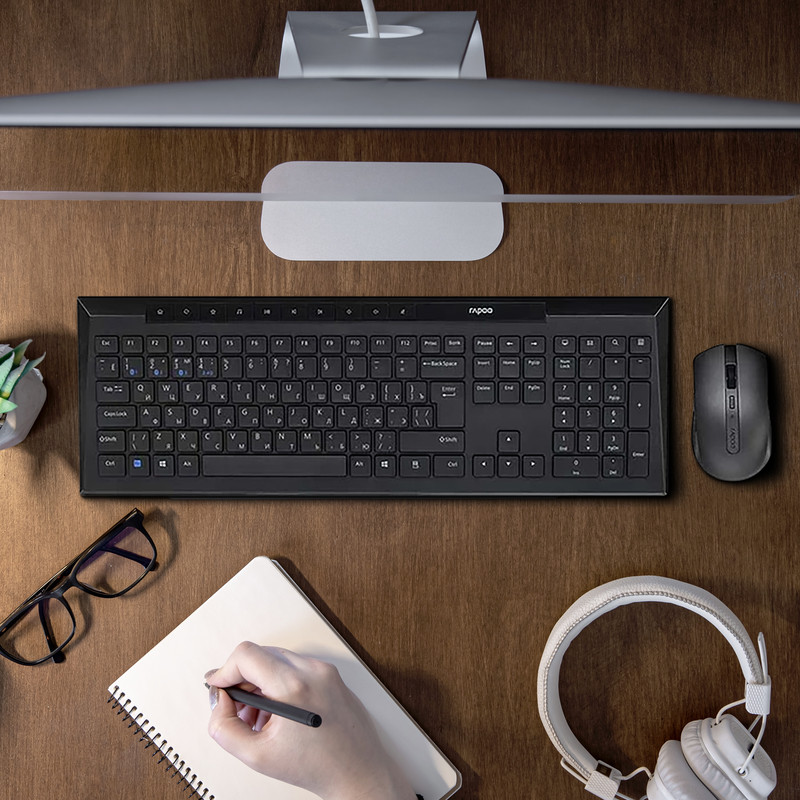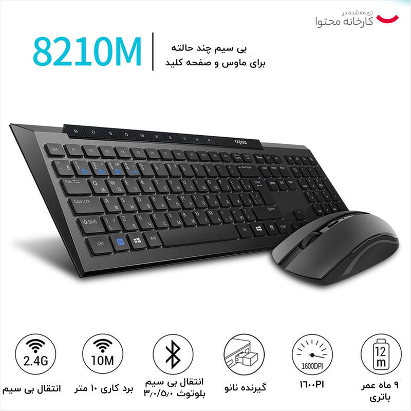 ست کیبورد و ماوس بیسیم رپو مدل 8210M یک مجموعهی حرفهای و کاربردی برای کاربران اداری، خانگی و حرفهای است که به دنبال اتصال بیسیم پایدار، مصرف انرژی بهینه و طراحی ارگونومیک هستند. این مدل از دو روش ارتباطی بلوتوث نسخه ۴.۰ و دانگل USB با فرکانس ۲.۴ گیگاهرتز پشتیبانی میکند که امکان اتصال همزمان به چند دستگاه را فراهم کرده و جابجایی بین دستگاهها را آسان میکند. کیبورد Full-Size این مجموعه با ۱۱۳ کلید استاندارد و ۱۲ کلید میانبر چندرسانهای، امکان کنترل سریع تنظیمات و برنامهها را فراهم کرده است. کلیدهای ممبران نرم و بیصدا، تایپ راحت و کمصدا را امکانپذیر میکنند و پایههای ضد لغزش و طراحی ارگونومیک مانع از خستگی دست در استفادهی طولانیمدت میشوند. بدنهی ترکیبی از پلاستیک ABS و فلز، باعث دوام و استحکام بالای این کیبورد شده است. ماوس این مجموعه دارای ۵ کلید کاربردی و دقت قابل تنظیم تا ۱۶۰۰ DPI است که حرکت دقیق و سریع را روی سطوح مختلف تضمین میکند. همچنین، مصرف بهینهی انرژی باعث میشود که با یک باتری قلمی (AA) تا ۹ ماه بدون نیاز به تعویض باتری کار کند. این ست با تمامی سیستمعاملها سازگار بوده و گزینهای مناسب برای کاربران حرفهای و چندکاره محسوب میشود.