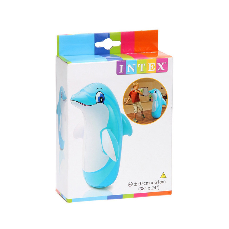 کیسه بوکس طرح دلفین اینتکس برای کودکان بالای سه سال طراحی شده و به شکل یک دلفین آبی رنگ زیبا است که ساعت ها این بوکسورهای کوچک را به بازی سرگرم می‌کند. جنس بدنه کیسه بوکس از PVC (وینیل) که ضد حساسیت و کاملا بهداشتی است و سلامت کودک دلبند شما را تهدید نمی‌کند. این کیسه بوکس‌ها برای بچه‌های فعال مناسب بوده تا با مشت های بی امان انرژی خود را تخلیه کنند. انتهای کیسه بوکس بادی یک مخزن جهت ریختن آب تعبیه شده تا با زدن هر ضربه به آن کیسه نیفتد و به حالت ایستاده برگردد(قبل از باد کردن کیسه ابتدا مخزن آب را پر کنید). برای بادکردن کیسه روی بدنه آنها یک دریچه پستونکی کوچک هست که براحتی می‌شود آن را باد کرد و همچنین دارای سوپاپ برگشت هوا می‌باشد که از خارج شدن هوا جلوگیری می‌کند. در بسته بندی این محصول 2 دستکش مخصوص و همچنین یک عدد برچسب تعمیرات کاغذی همراه این محصول بوده که در صورت سوراخ شدن یا پارگی از این برچسب برای تعمیر و پنچرگیری می‌توانید استفاده کنید.