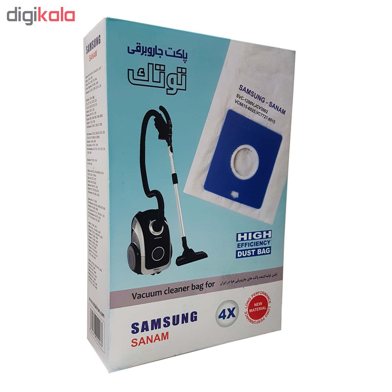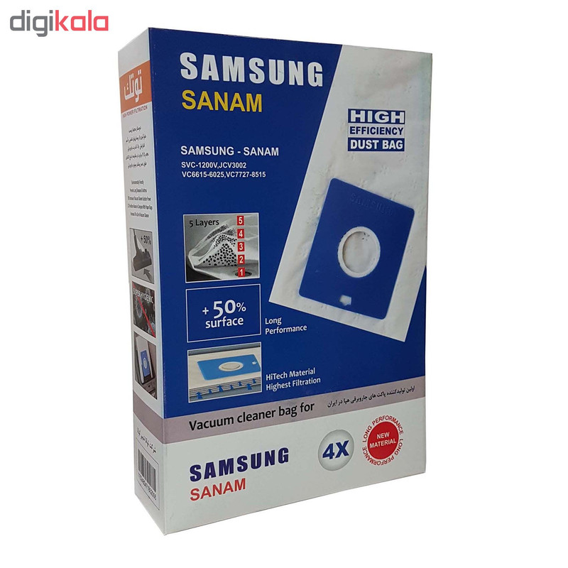 سایر توضیحاتچهار عدد پاکت پنج لایه هپا عدم افت مکش جاروبرقی صرفه جویی در خرید پاکت تهیه شده از مواد بهداشتی ضد باکتری و دوستدار محیط زیست حداقل نشت خاک و ریزگرد به محیط مناسب جاروبرقی صنام , سامسونگ مدلهای SVC-1200V, JCV3002, VC6615-6025 , VC7727-8515