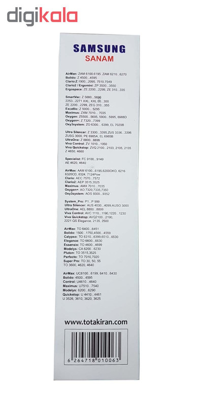 سایر توضیحات چهار عدد پاکت پنج لایه هپا عدم افت مکش جاروبرقی صرفه جویی در خرید پاکت تهیه شده از مواد بهداشتی ضد باکتری و دوستدار محیط زیست حداقل نشت خاک و ریزگرد به محیط مناسب جاروبرقی صنام , سامسونگ مدلهای SVC-1200V, JCV3002, VC6615-6025 , VC7727-8515