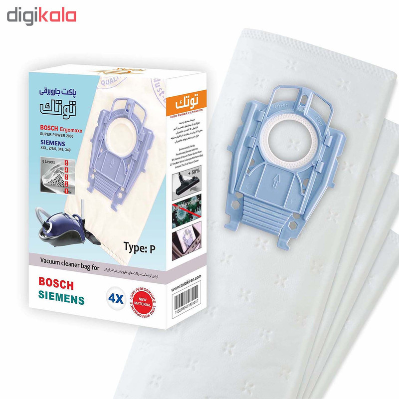 | سایر توضیحات | چهار عدد پاکت پنج لایه هپا عدم افت مکش جاروبرقی صرفه جویی در خرید پاکت تهیه شده از مواد بهداشتی ضد باکتری و دوستدار محیط زیست حداقل نشت خاک و ریزگرد به محیط مناسب جاروبرقی بوش مدل ارگومگس (TYPE P) سوپر پاور مناسب جاروبرقی زیمنس مدلهای XXL,Z/6/0 ,348,349 |