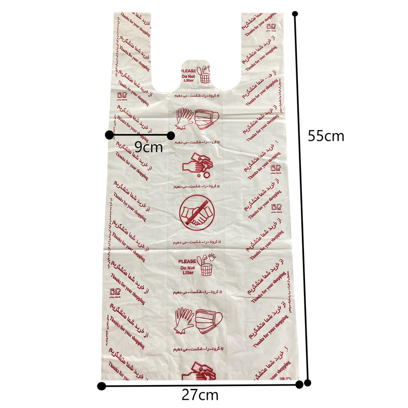 | سایر توضیحات | ابعاد درحالت بسته با احتساب دسته نایلون:54×27 سانتی متر این نایلون دسته دار تهیه شده از مواددرجه یک و اعلا بدون بو با چاپ طرح کرونا مناسب جهت مصارف رستوران ها،خشکبار فروشی ها، لوکس فروشی هاو... سایز باز شده این پلاستیک 45×55 سانتی متر میباشد بسته 1000 عددی |