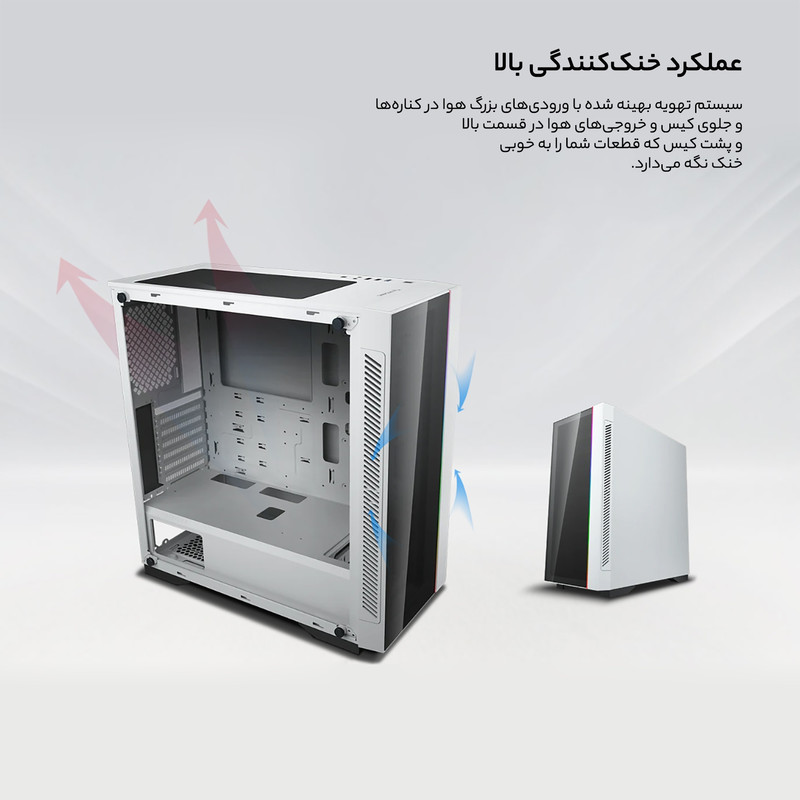 | مشخصات تکمیلی | دارای کلید تعبیه شده برای تغییر رنگ RGB فن ها از روی خود بدنه کیس |