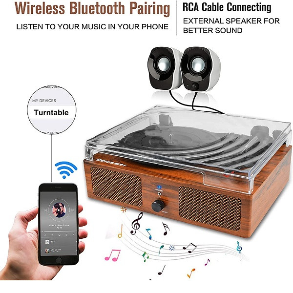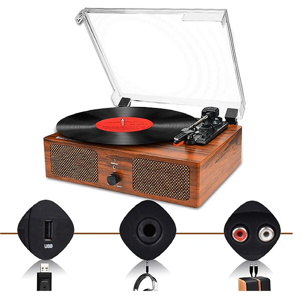 از نظر اتصالات، این گرامافون علاوه بر اصالت کلاسیک، مجهز به فناوریهای مدرن است. فناوری Bluetooth اتصال بیسیم به گوشیهای هوشمند را امکانپذیر میسازد. ورودیهای USB Type-A و جک ۳.۵ میلیمتری صدا (AUX) نیز برای پخش از منابع دیگر در دسترس هستند. پورت RCA نیز برای اتصال به اسپیکر و تقویت صدای خارجی در نظر گرفته شده است. این دستگاه فاقد رقص نور و قابلیت شارژ داخلی است و از طریق آداپتور برق ۵ ولت ۱.۵ آمپر تغذیه میشود. اقلام همراه این پخشکننده شامل کابل برق و دفترچه راهنما است.
