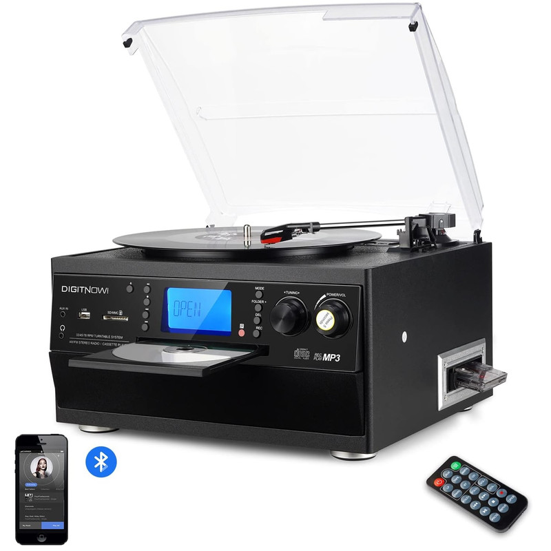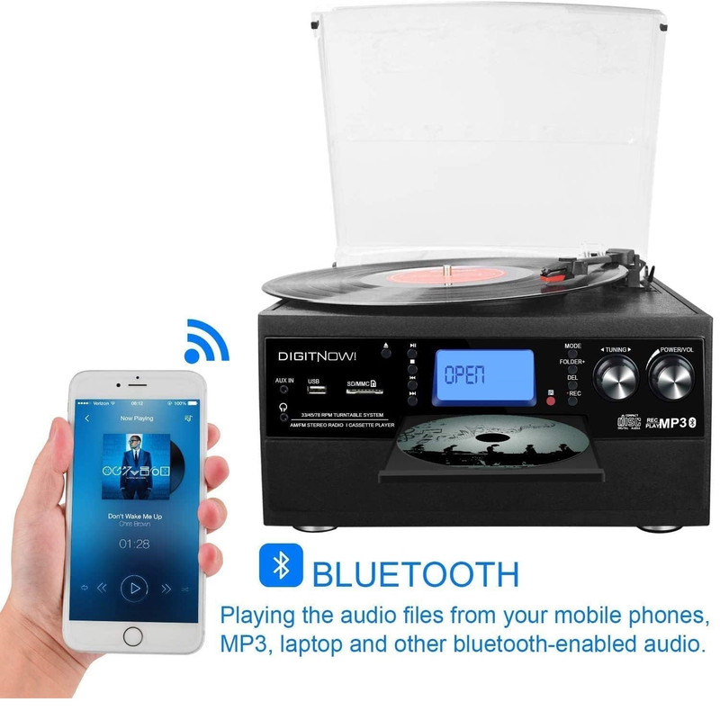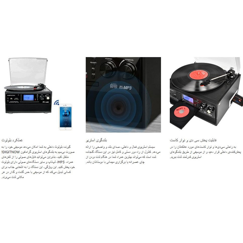 سایر توضیحاتگرامافون پخش کننده بلوتوث DIGITNOW با بلندگوی استریو، تبدیل وینیل LP به MP3 با CD، کاست، رادیو، ورودی AUX و رمزگذاری USB/SD، کنترل از راه دور، پخش کننده موسیقی صوتی با آمپلی فایر داخلی ۳ سرعت قابل انتخاب - تنظیمات سرعت ۳۳/۴۵/۷۸ دور در دقیقه به همراه آداپتور ۴۵ دور در دقیقه. پخش‌کننده‌ی صفحه گرامافون بلوتوث برای صفحات وینیل با قابلیت حذف و حرکت سریع به جلو، ضبط و حذف. پخش رادیو استریوی آنالوگ AM/FM و تبدیل به MP3. ورودی Aux برای اتصال دستگاه‌های دیگر (سی‌دی، آی‌پاد، آی‌فون و غیره) پشتیبانی مستقیم از USB/SD برای صفحه گردان، بلندگوی استریو داخلی، صفحه نمایش LCD با نور پس زمینه، دارای کاور ضد گرد و غبار پخش کننده همه کاره ضبط صدا پخش‌کننده‌ی همه‌کاره، صدای فوق‌العاده‌ای ارائه می‌دهد که می‌تواند تمام نیازهای شما را برآورده کند. با قابلیت بلوتوث، پخش‌کننده‌ی سی‌دی و نوار کاست، بلندگوی استریوی داخلی و قابلیت ضبط روی دیسک USB/کارت SD. به راحتی موسیقی را در هر جنبه‌ای از زندگی خود - از روی میز تا کنار تخت، از صبح‌های آفتابی تا شب‌های بارانی - ادغام کنید. عملکرد بلوتوث گیرنده بلوتوث داخلی به شما امکان می‌دهد موسیقی خود را به صورت بی‌سیم به بلندگوهای استریوی گرامافون DIGITNOW! منتقل کنید، بنابراین می‌توانید فایل‌های صوتی را از تلفن‌های همراه، MP3، لپ‌تاپ و سایر دستگاه‌های صوتی دارای بلوتوث خود پخش کنید. این ویژگی، این دستگاه را به انتخابی جذاب برای کسانی تبدیل می‌کند که از موسیقی با حس گشت و گذار در هر مکانی لذت می‌برند. بلندگوی استریو سیستم استریوی فعال و داخلی، صدای بلند و واضحی را ارائه می‌دهد. کنترل از راه دور دستی و کامل نیز در این دستگاه گنجانده شده است که می‌تواند بهترین همراه شما در هنگام لذت بردن از چای عصرانه یا برگزاری مهمانی با دوستانتان باشد. قابلیت پخش سی دی و نوار کاست به راحتی سی‌دی‌ها و نوار کاست‌های مورد علاقه‌تان را در پخش‌کننده‌ی داخلی قرار دهید و از موسیقی از طریق بلندگوهای استریوی قدرتمند لذت ببرید.ورودی AUX از رابط 3.5 میلی‌متری، خروجی منابع صوتی ،رادیو AM/FM ، رمزگذاری USB/SD ،