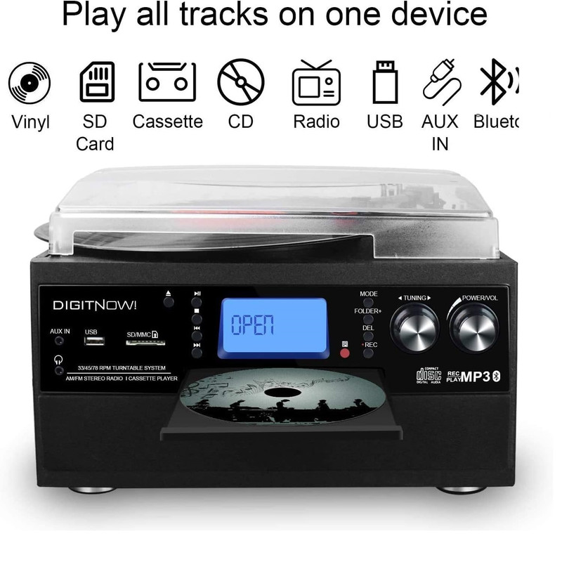 سایر توضیحات گرامافون پخش کننده بلوتوث DIGITNOW با بلندگوی استریو، تبدیل وینیل LP به MP3 با CD، کاست، رادیو، ورودی AUX و رمزگذاری USB/SD، کنترل از راه دور، پخش کننده موسیقی صوتی با آمپلی فایر داخلی ۳ سرعت قابل انتخاب - تنظیمات سرعت ۳۳/۴۵/۷۸ دور در دقیقه به همراه آداپتور ۴۵ دور در دقیقه. پخش‌کننده‌ی صفحه گرامافون بلوتوث برای صفحات وینیل با قابلیت حذف و حرکت سریع به جلو، ضبط و حذف. پخش رادیو استریوی آنالوگ AM/FM و تبدیل به MP3. ورودی Aux برای اتصال دستگاه‌های دیگر (سی‌دی، آی‌پاد، آی‌فون و غیره) پشتیبانی مستقیم از USB/SD برای صفحه گردان، بلندگوی استریو داخلی، صفحه نمایش LCD با نور پس زمینه، دارای کاور ضد گرد و غبار پخش کننده همه کاره ضبط صدا پخش‌کننده‌ی همه‌کاره، صدای فوق‌العاده‌ای ارائه می‌دهد که می‌تواند تمام نیازهای شما را برآورده کند. با قابلیت بلوتوث، پخش‌کننده‌ی سی‌دی و نوار کاست، بلندگوی استریوی داخلی و قابلیت ضبط روی دیسک USB/کارت SD. به راحتی موسیقی را در هر جنبه‌ای از زندگی خود - از روی میز تا کنار تخت، از صبح‌های آفتابی تا شب‌های بارانی - ادغام کنید. عملکرد بلوتوث گیرنده بلوتوث داخلی به شما امکان می‌دهد موسیقی خود را به صورت بی‌سیم به بلندگوهای استریوی گرامافون DIGITNOW! منتقل کنید، بنابراین می‌توانید فایل‌های صوتی را از تلفن‌های همراه، MP3، لپ‌تاپ و سایر دستگاه‌های صوتی دارای بلوتوث خود پخش کنید. این ویژگی، این دستگاه را به انتخابی جذاب برای کسانی تبدیل می‌کند که از موسیقی با حس گشت و گذار در هر مکانی لذت می‌برند. بلندگوی استریو سیستم استریوی فعال و داخلی، صدای بلند و واضحی را ارائه می‌دهد. کنترل از راه دور دستی و کامل نیز در این دستگاه گنجانده شده است که می‌تواند بهترین همراه شما در هنگام لذت بردن از چای عصرانه یا برگزاری مهمانی با دوستانتان باشد. قابلیت پخش سی دی و نوار کاست به راحتی سی‌دی‌ها و نوار کاست‌های مورد علاقه‌تان را در پخش‌کننده‌ی داخلی قرار دهید و از موسیقی از طریق بلندگوهای استریوی قدرتمند لذت ببرید.ورودی AUX از رابط 3.5 میلی‌متری، خروجی منابع صوتی ،رادیو AM/FM ، رمزگذاری USB/SD ،
