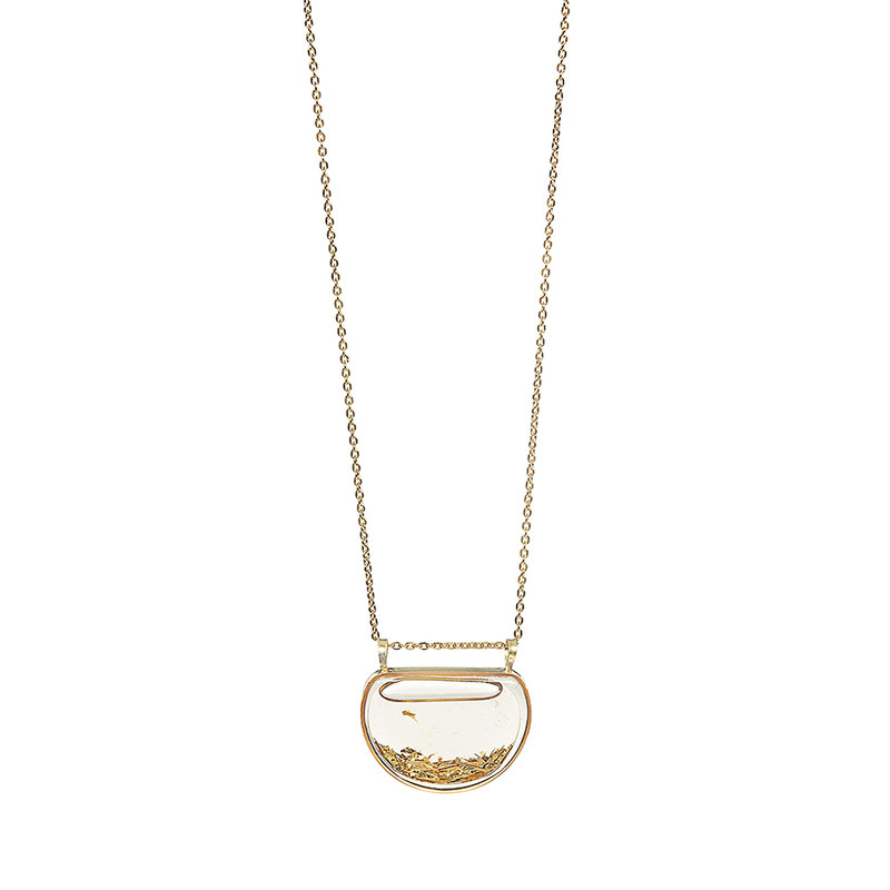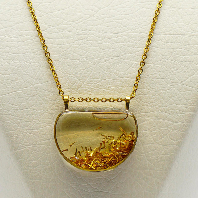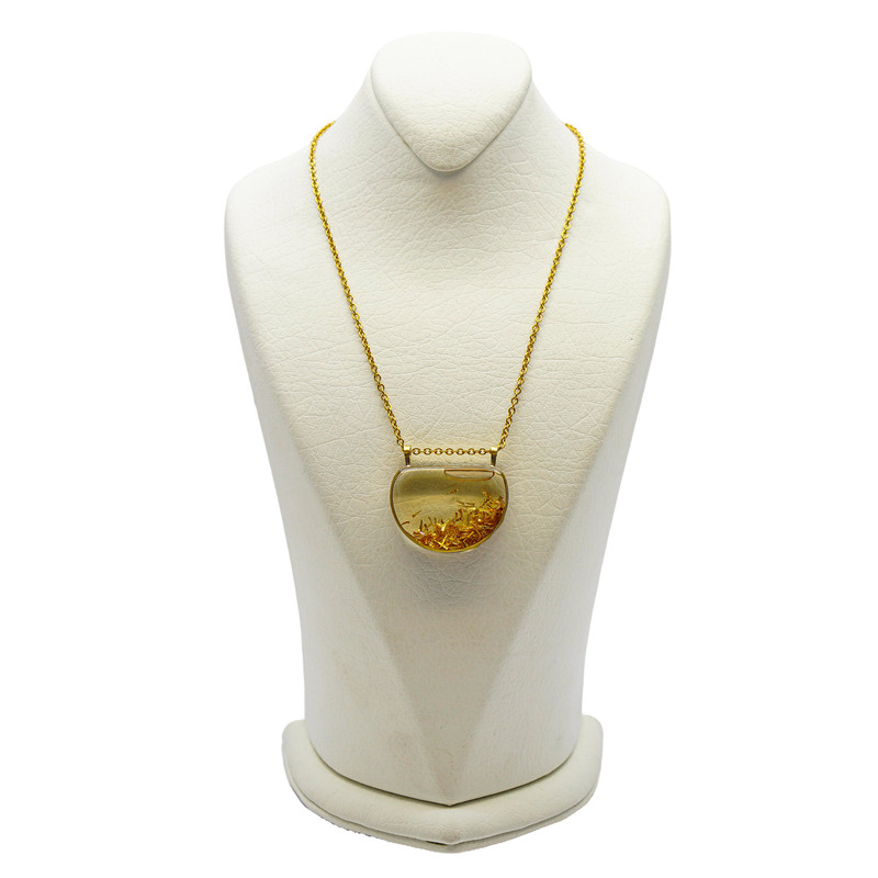 گردنبند طرح لبخند براده های طلا یکی از جذابترین و باکلاسترین هدایایی است که یک نفر میتواند به فرد مورد علاقهاش بدهد. این کالای نفیس مناسب خانمهای جوان و میانسال بوده که به زیورآلات ظریف علاقمند هستند. این گردنبند مناسب میهمانیهای کوچک و بزرگ و مجالس و جشنها است. گردنبند طلا طرح لبخند از برادههای ریز طلا پر شده که جلوه خاصی به گردنبند در گردن شما میدهد؛ مخصوصا زمانی که سرتان را تکانی میدهید و برادههای داخل آن جابجا میشوند و زیبایی محسور کنندهای را بوجود میآورند که بدون شک توجه هر کسی را جلب میکند و شما را بیش از پیش برای خرید این گردنبند راضی نگه میدارد.نکته قابل توجه این گردنبند این است که شیشه ای نیست و اصلا نمیشکند و محتویات داخلش همیشه در آنجا می ماند و جای هیچ نگرانی نیست از پوشش رزینی توسط دستان توانمند هنرمندان کشور عزیزمان تولید شده است.اطراف پلاک با برنز ساخته شده است که رنگش ثابت می باشد و اصلا سیاه نمی شود. جنس زنجیر این گردنبند از استیل بوده و در اثر گذشت زمان رنگ خود را از دست نمیدهد و با تفاوت رنگ نسبتا کمی که با برادههای روکش طلا دارد، ترکیب رنگ زیبایی را ایجاد میکند. برادهها داخل یک محفظه کوچک و شفاف ریخته شدهاند که باعث ظرافت هرچه بیشتر کار شده است.همچنین به خاطر بلند بودن زنجیر این اثر ، آن را میتوانید به عنوان رو مانتویی استفاده کنید و جلوه بسیار زیبایی برایتان ایجاد خواهد کرد و مثل نگینی در میهمانی خواهید درخشید. براق بودن این اثر باعث می شود با هر رنگ از لباسی ست شود. براده های داخل محفظه ، از ورق نازک طلا روی فویل لمینت شده اند و این کار یه کار فوق العاده زیبا و ارزشمند است