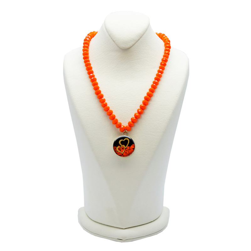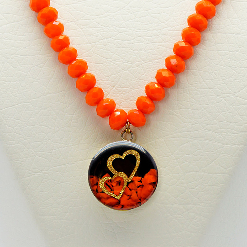 این گردنبند زیبا با مهرههای نارنجی رنگ طراحی شده که با انرژی گرم و شاد خود، حس سرزندگی و مثبتاندیشی را به همراه دارد. در مرکز آن، پلاکی با طرح دو قلب طلایی قرار گرفته که نمادی از عشق و پیوند عاطفی است. این نماد با روکش طلا و لایهای از رزین شفاف پوشانده شده تا در برابر خط و خش و تغییر رنگ مقاوم باشد. اجزای فلزی گردنبند ضدحساسیت هستند و برای استفاده طولانیمدت روی پوست، کاملاً ایمن طراحی شدهاند.