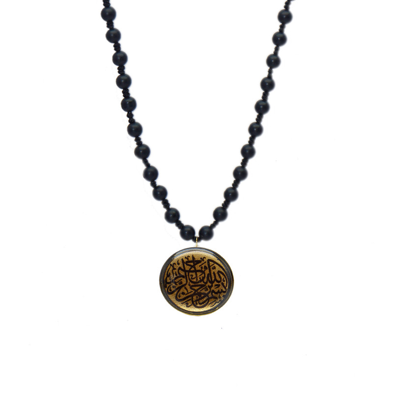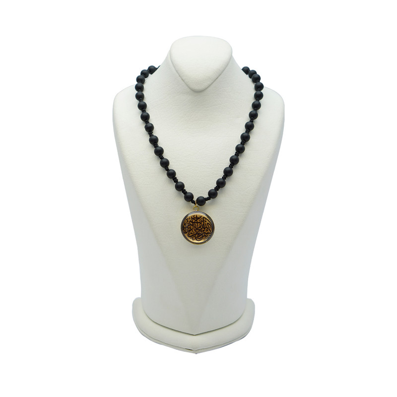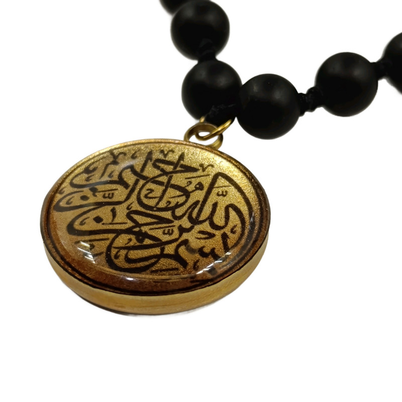 این گردنبند با مهرههای سنگی مشکی باکیفیت و پلاکی با طرح زیبای "بسمالله الرحمن الرحیم" ساخته شده که با ورق طلای درخشان تزیین شده است. استفاده از طلا در طراحی پلاک، درخشش خیرهکنندهای به آن میبخشد و جلوهای متمایز در میان زیورآلات مشابه ایجاد میکند.
