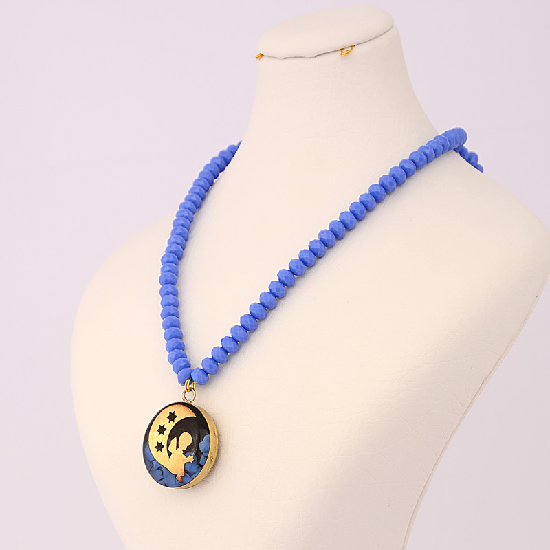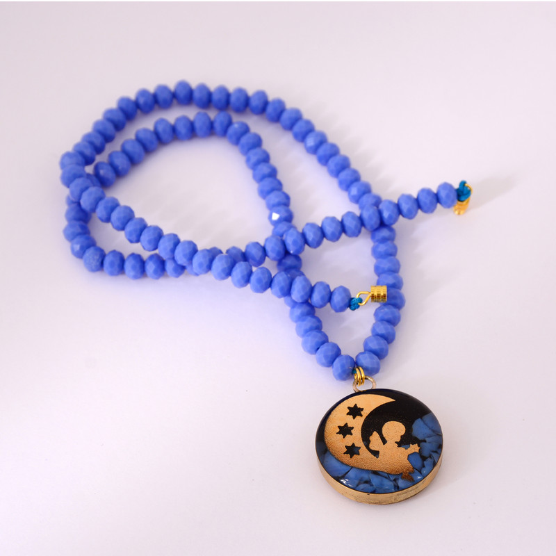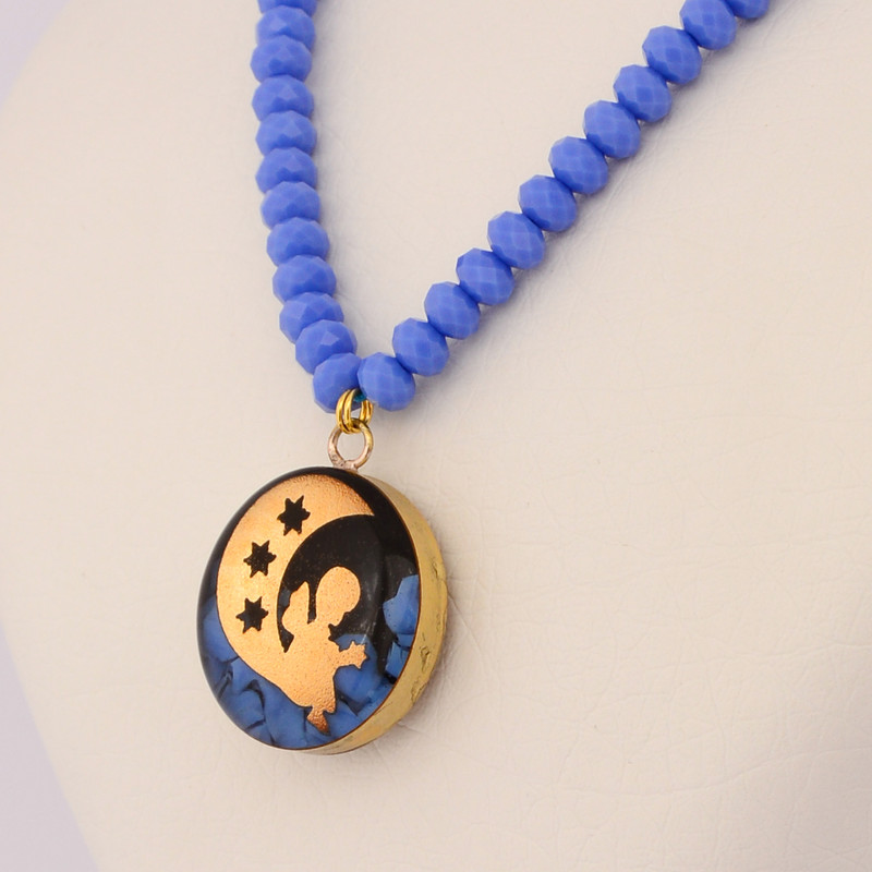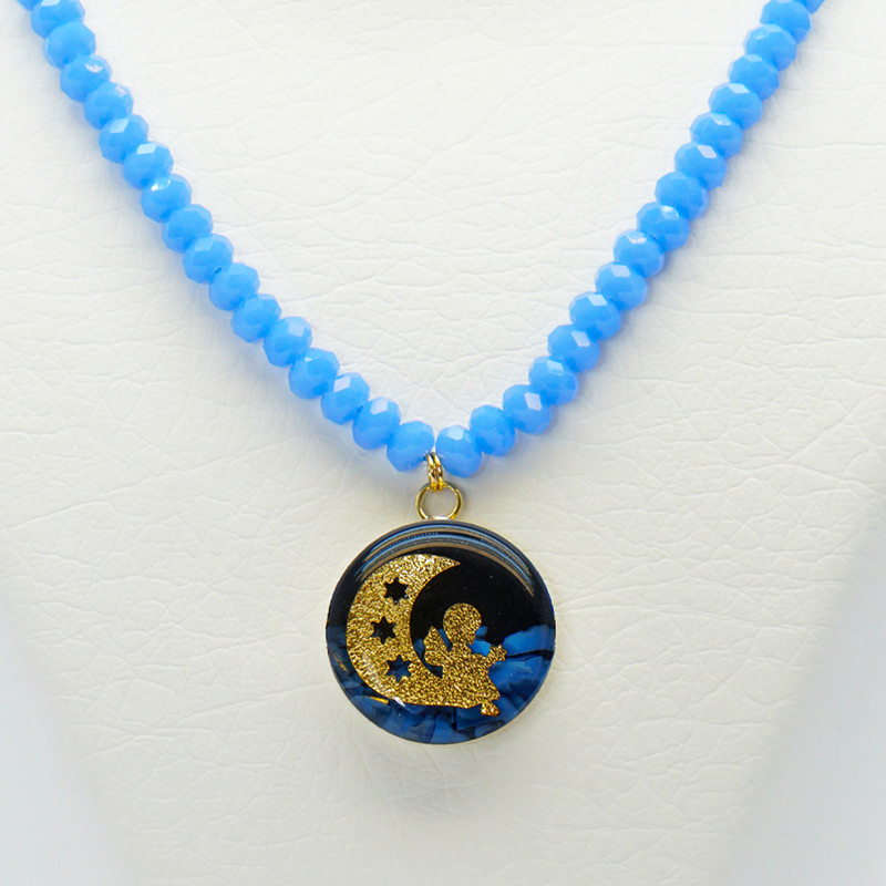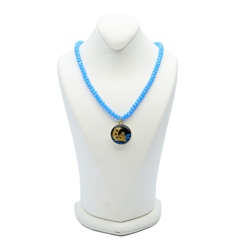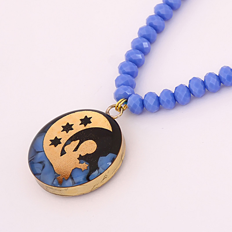 گردنبندی الهامگرفته از دنیای رویاها؛ نماد ماه و فرشته با روکش طلایی و پوشش رزینی، درخشش آرام و محافظتشدهای دارد که در کنار سنگهای طبیعی اونیکس آبی، حس آرامش و تعادل را در استایل شما جاری میکند. طراحی زیبا و معنابخش این گردنبند، آن را به انتخابی خاص برای هدیه دادن یا استفاده روزمره تبدیل کرده است. متریال استفادهشده کاملاً ضدحساسیت بوده و در برابر تعریق و رطوبت، دچار تغییر رنگ نمیشود.