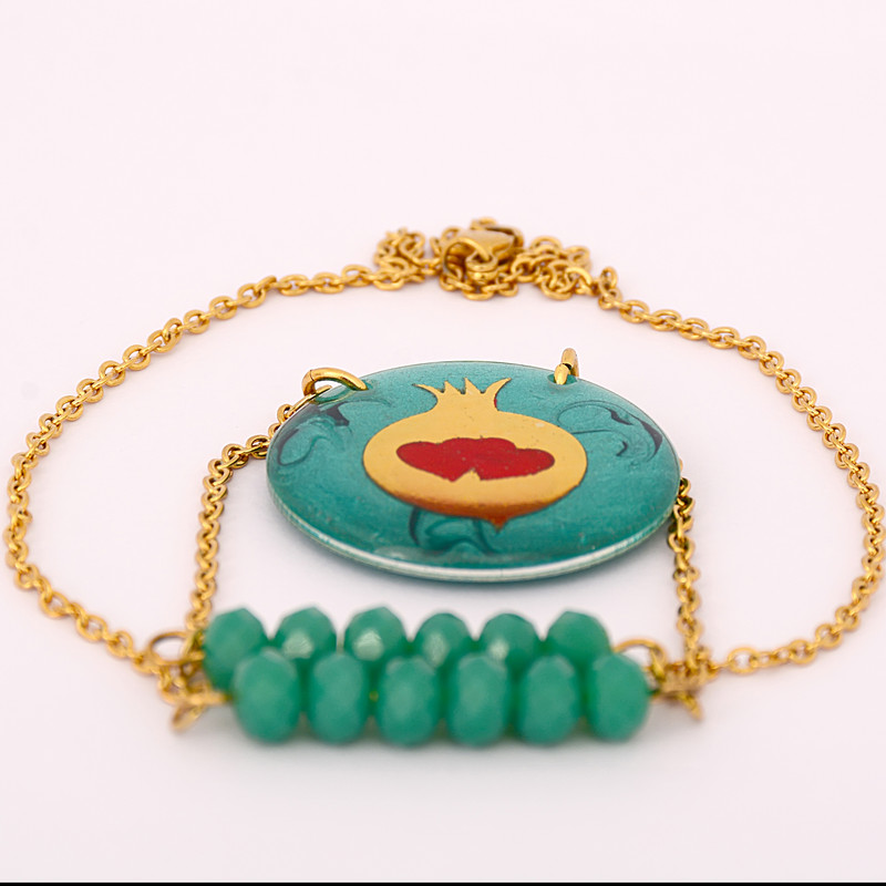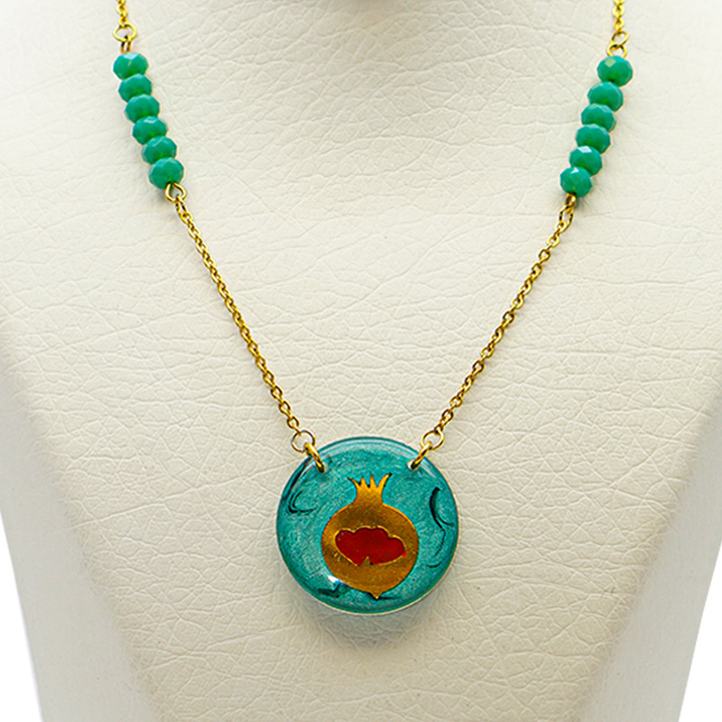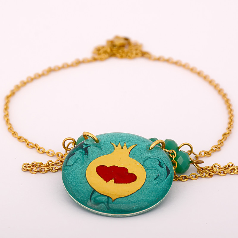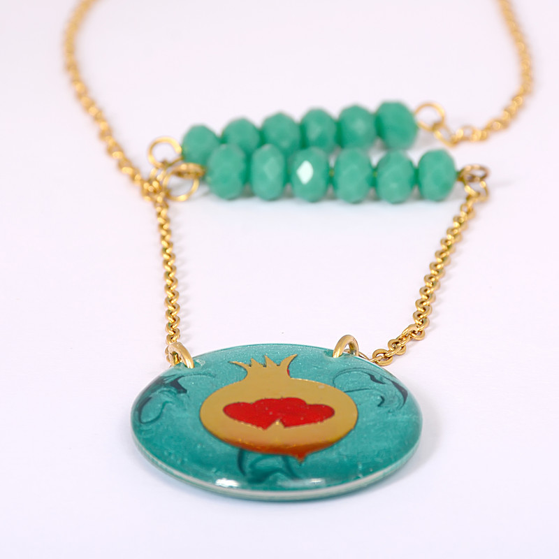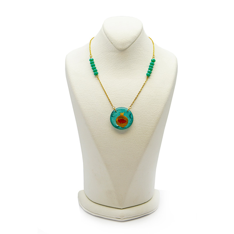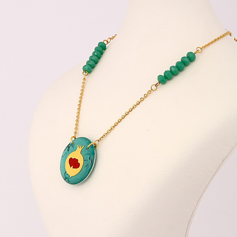 گردنبند طرح انار زیوری نمادین و چشمنواز است که با استفاده از سنگهای سبز و آویز دستساز، جلوهای ویژه پیدا کرده است. در مرکز کار، آویز دایرهای قرار دارد که درون آن طرح انار از جنس ورق طلا با ظرافت اجرا شده و برای محافظت و افزایش دوام، با رزین شفاف پوشانده شده است تا سطحی براق و مقاوم ایجاد کند.