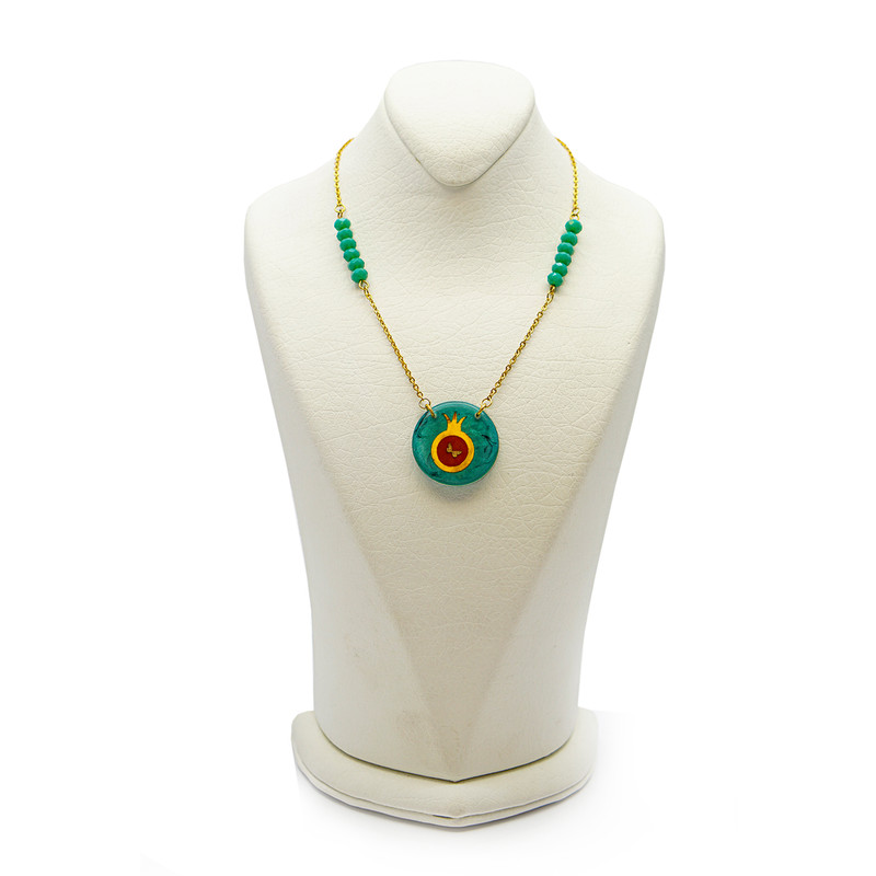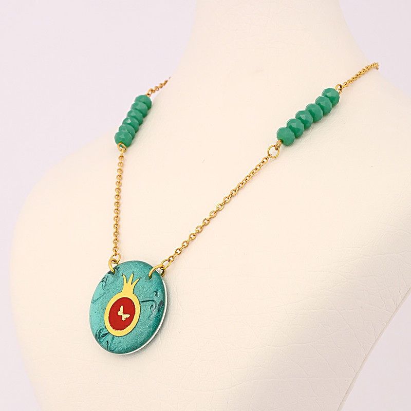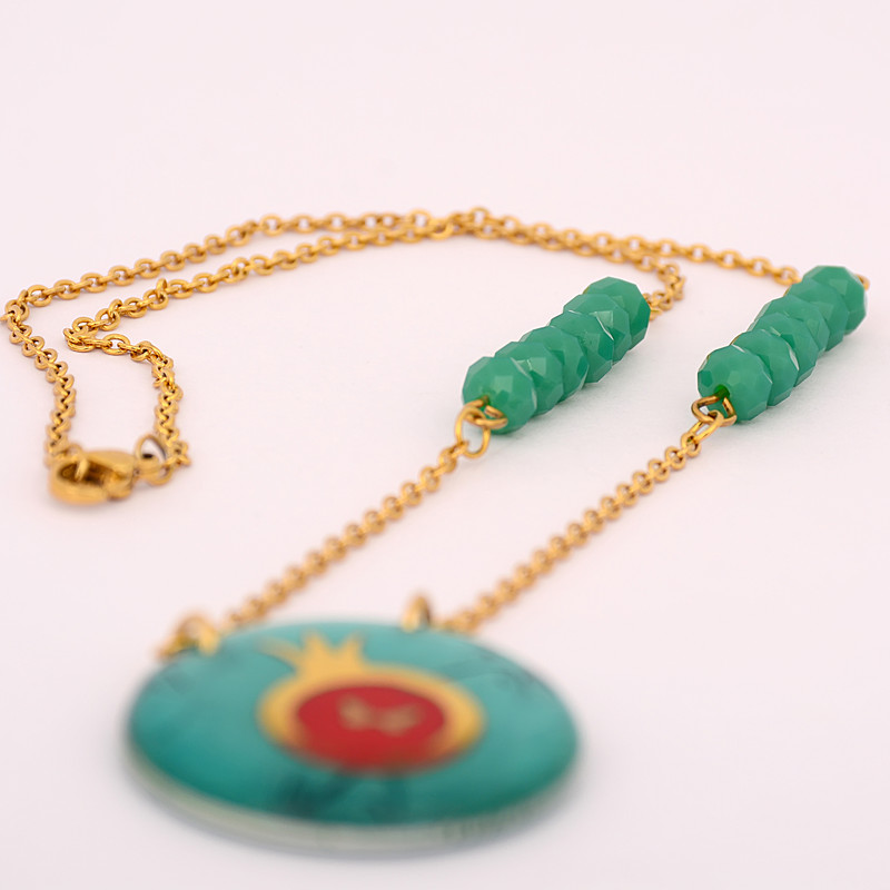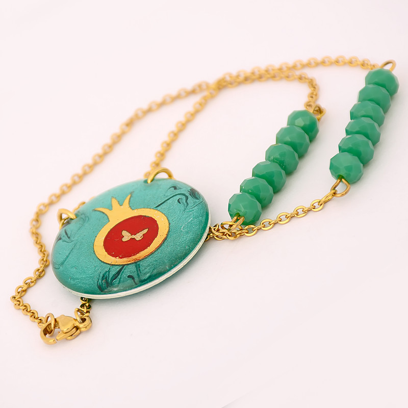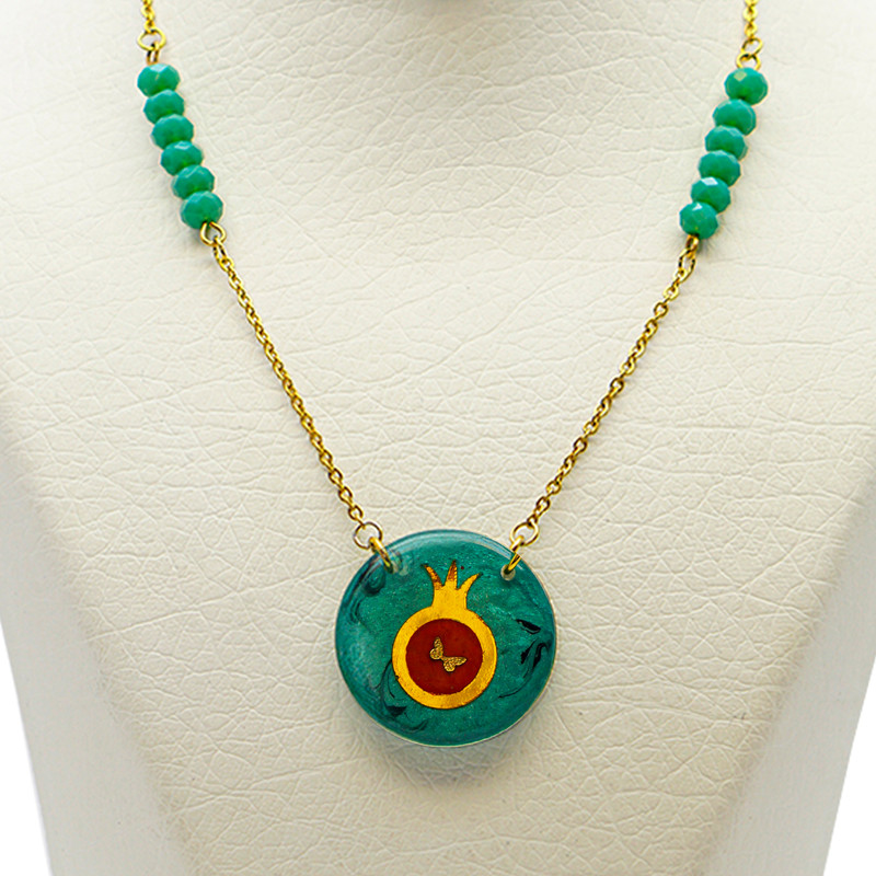 گردنبند انار و پروانه یک زیور دستساز زیبا و هنری است که با ترکیب رنگ فیروزهای و عناصر سنتی ایرانی، جلوهای چشمگیر ایجاد میکند. پلاک گرد این گردنبند شامل طرح انار و پروانه است که با ورق طلا ساخته و روی آن کار شده و سپس با رزین شفاف پوشانده شده تا سطحی براق، یکدست و محافظتشده ایجاد شود.