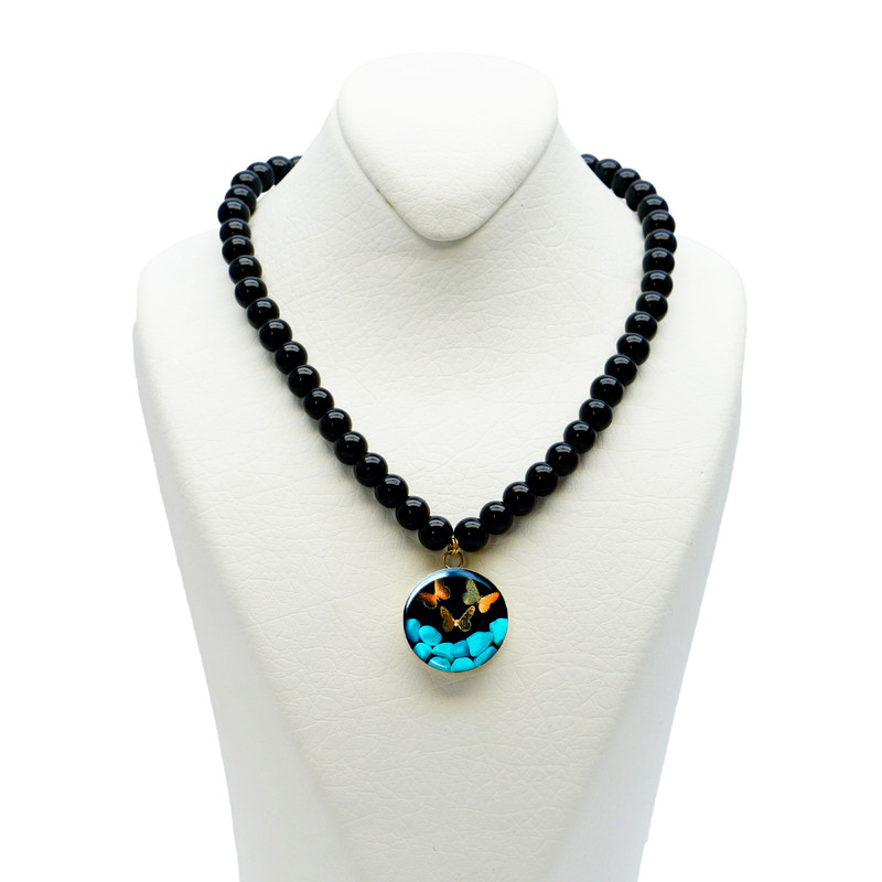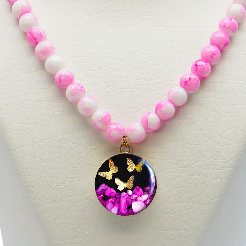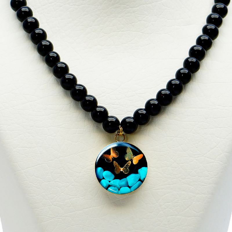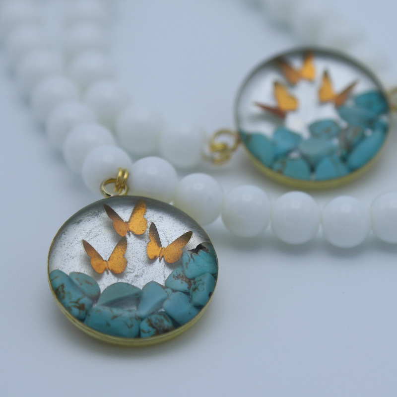 گردنبند روکش طلا سه پروانه جلوهای زیبا از ترکیب سنگهای طبیعی و هنر دست است. مهرههای آن از سنگ اونیکس سفید ساخته شدهاند که با درخشش خاص خود جلوهای شیک و چشمنواز ایجاد میکنند. آویز گردنبند شامل پلاکی دایرهای است که درون آن سنگهای فیروزهای طبیعی به همراه سه پروانه ظریف از ورق طلا قرار گرفتهاند. برای محافظت از طرح، روی آویز با رزین شفاف پوشانده شده تا دوام و درخشندگی آن حفظ شود.