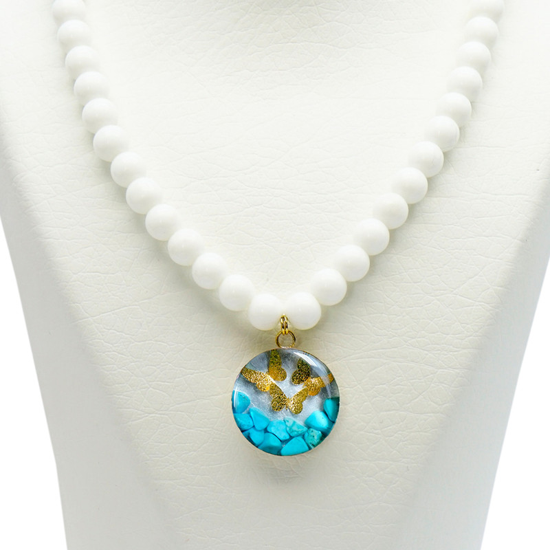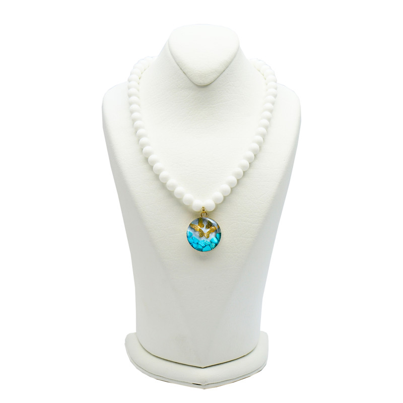 جنس پشت آویز از برنج باکیفیت است که ضد حساسیت بوده و در صورت عدم تماس با مواد شوینده و شیمیایی، تغییر رنگ نمیدهد. ترکیب هماهنگ رنگ سفید، آبی فیروزهای و طلایی، این گردنبند را به زیوری خاص و ماندگار برای استفاده در استایلهای روزمره و رسمی تبدیل کرده است