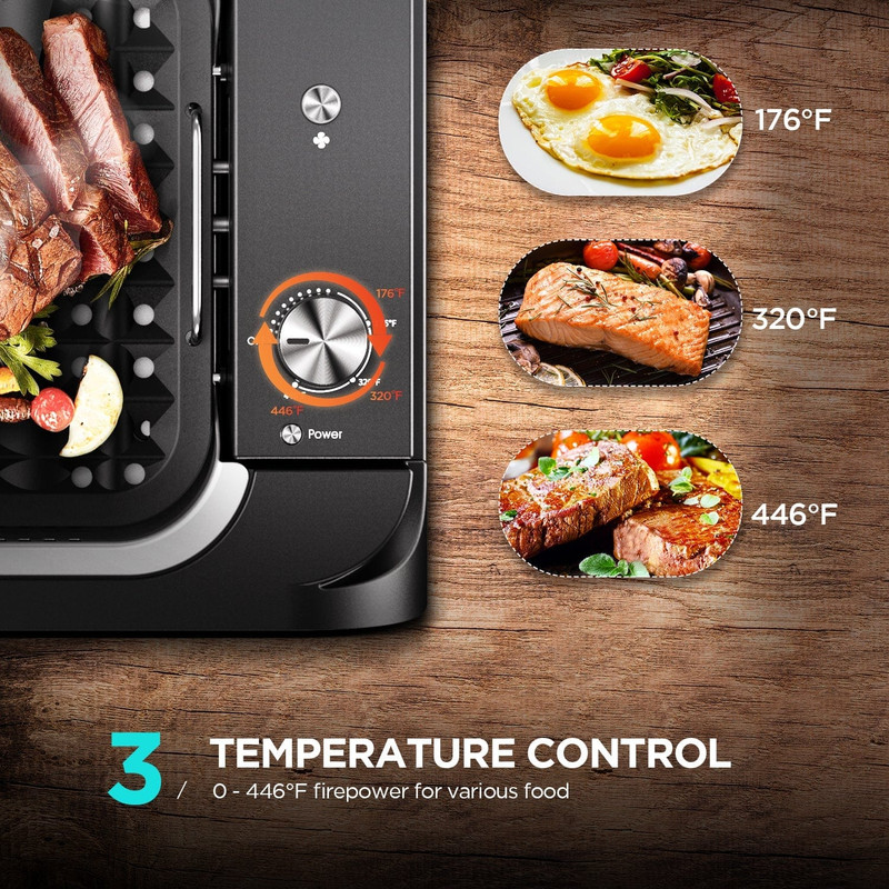 بافت و طعم بهتر: محدوده دما از 0℉ تا 446℉ است، گرما را با یک دکمه ترموستات کنترل کنید. غذا را کاملاً با علامت گریل بپزید و لطیف و آبدار را بدون چربی زیاد نگه دارید. 3 وعده غذایی با بشقاب شامل: شامل گریل و بشقاب کبابی نچسب با سطح پخت جادار 14.0×7.9 اینچ. بشقاب گریل برای کباب کردن چندگانه مانند استیک، دنده و سبزیجات؛ بشقاب توری برای صبحانه مانند تخم مرغ، بیکن و پنکیک.