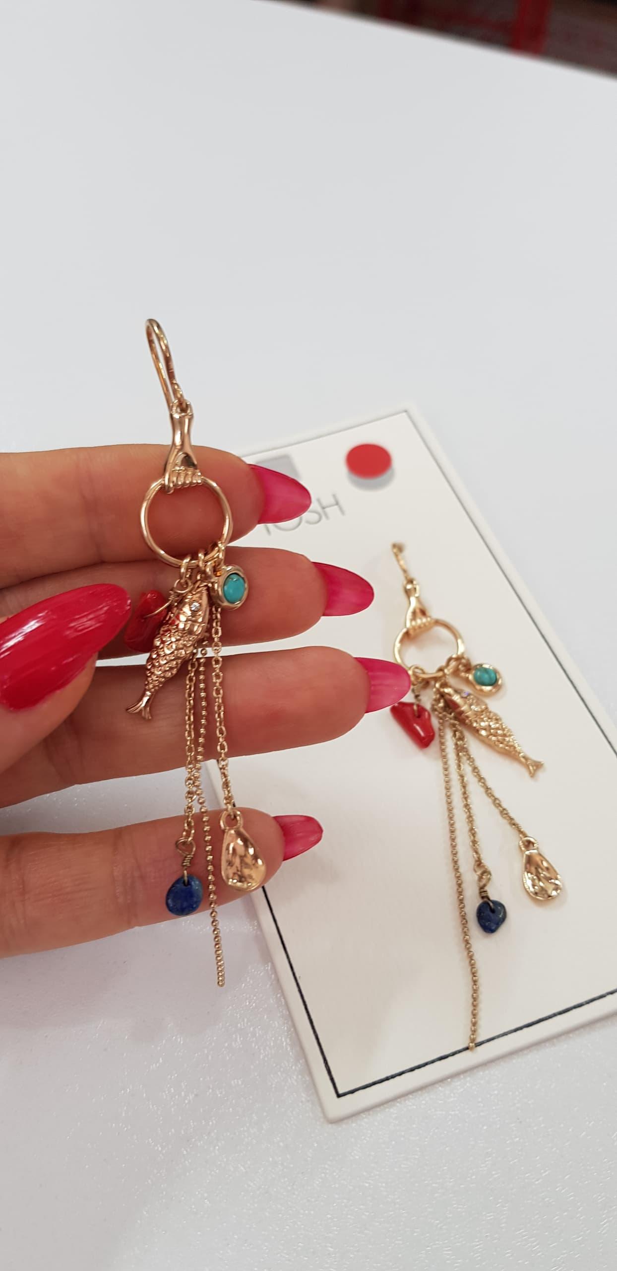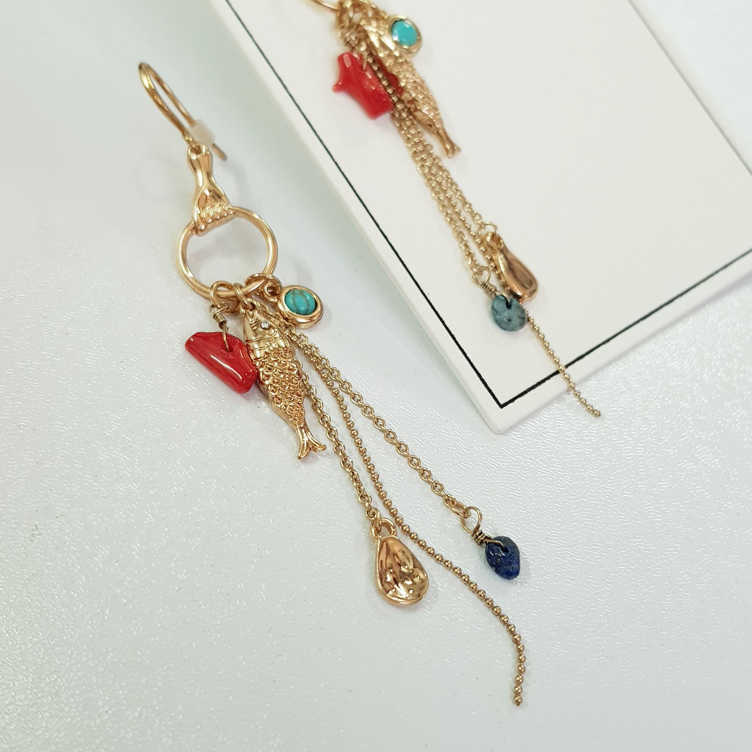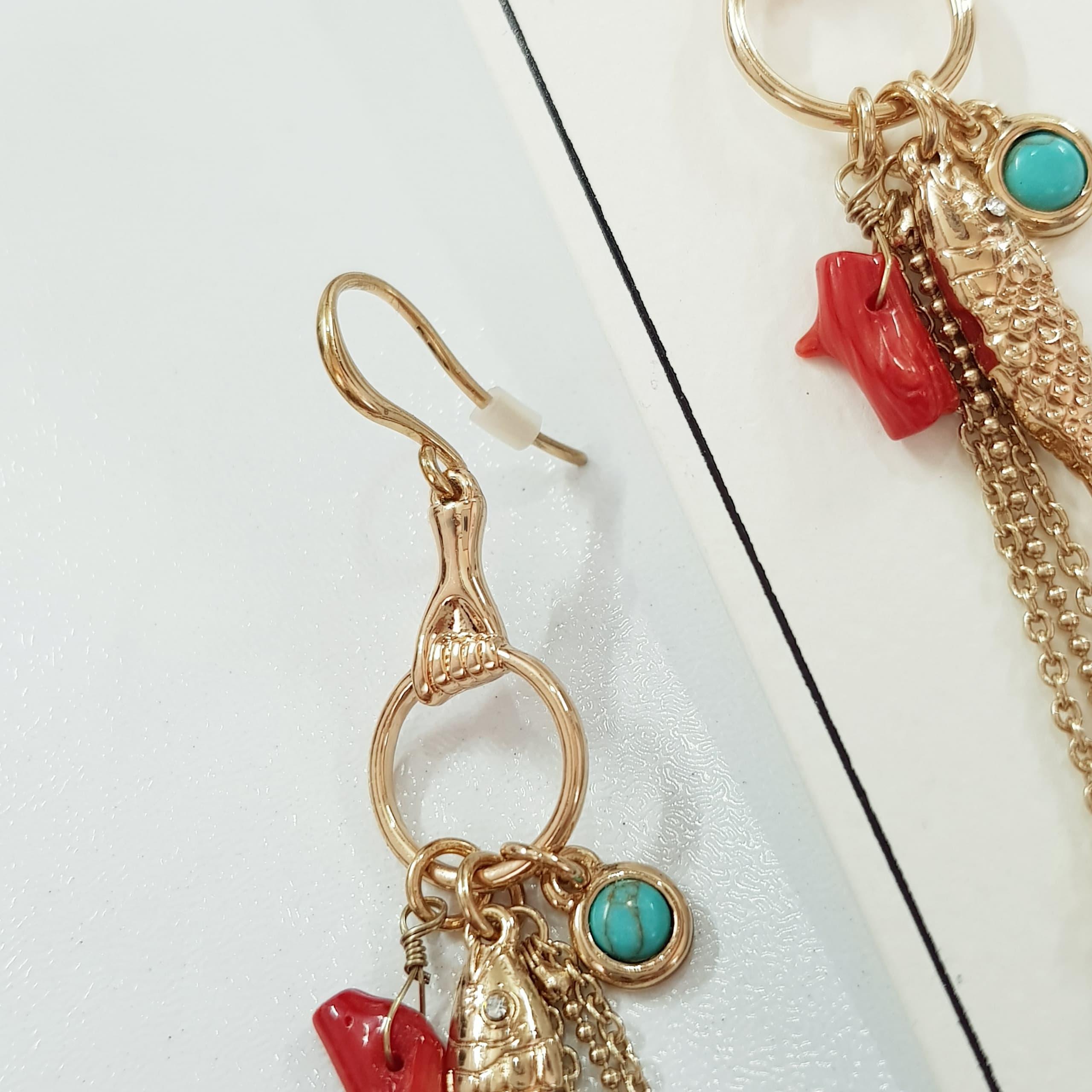 گوشواره عصایی آویز سنگ مرجان قرمز ، فیروزه و لاجورد آبی ، کار فوقالعاده حرفه ای و زیبا ، از برند آلمانی TOSH