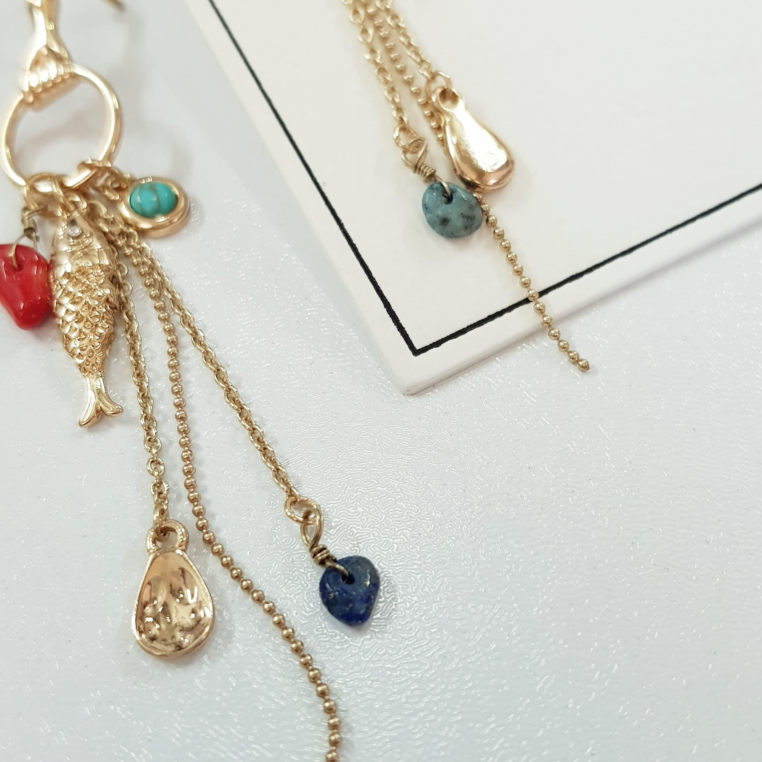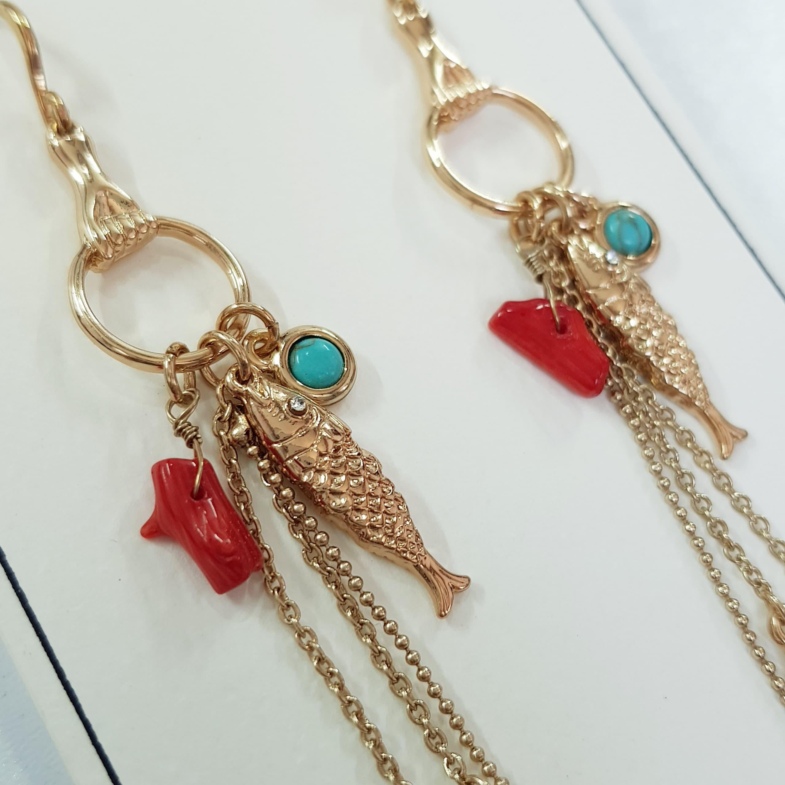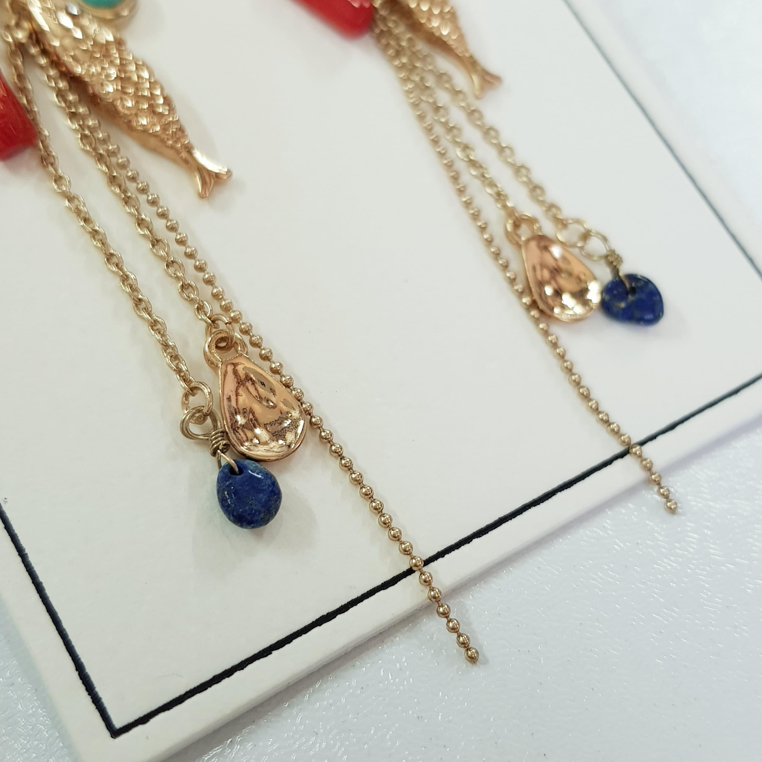 گوشواره عصایی آویز سنگ مرجان قرمز ، فیروزه و لاجورد آبی ، کار فوقالعاده حرفه ای و زیبا ، از برند آلمانی TOSH