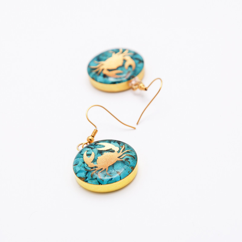 این گوشواره چشم‌نواز با طراحی خاص، نماد ماه تولد تیر (برج سرطان/خرچنگ) را با ترکیبی از سنگ طبیعی فیروزه و روکش طلای مرغوب به نمایش می‌گذارد. زمینه گوشواره از سنگ فیروزه اصل ساخته شده است که با رنگ آبی پرنشاط خود، جلوه‌ای طبیعی و زیبا به محصول بخشیده است. نماد طلایی خرچنگ که با دقت و ظرافت روی گوشواره اجرا شده، تنها قسمت طلایی آن بوده و با روکش طلای ضخیم 5 میکرون طراحی شده است که درخشندگی و ماندگاری طولانی‌مدت محصول را تضمین می‌کند.