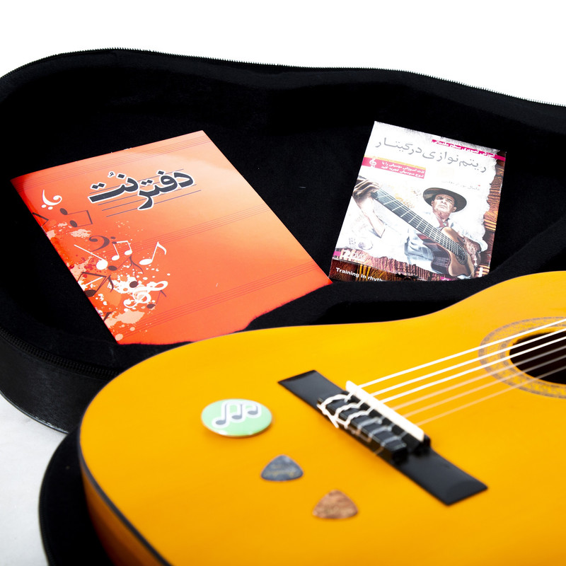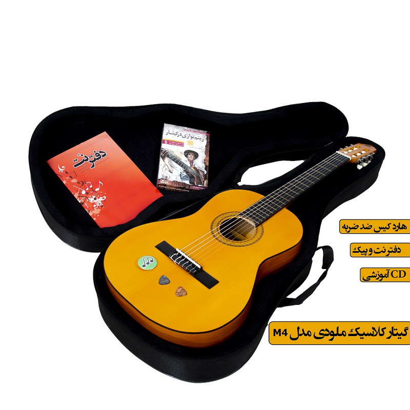 گیتار ملودی خوش دست و خوش صدا و خوش سیما مدل m4 ساخت ایران است . و یک گیتار محکم و با کیفیت است.این گیتار به افرادی که قصد دارند نواختن گیتار را شروع کنند کمک زیادی خواهد کرد؛ چون می توانند با پرداخت هزینه بسیار کم صاحب یک گیتار باکیفیت شوند که در سطح رقیبان خارجی خود و چه بسا بالاتر از آن ها کیفیت دارد و تا سال ها و سطوح بالاتر هم می توانند از نواختن آن لذت ببرند؛ به همین جهت است که بسیاری از اساتید موسیقی این گیتار را به هنرجویان خود پیشنهاد میدهند.سایز این گیتار ۴/۴ است که مناسب رده سنی یازده سال به بالا می باشد.صفحه رویی گیتار چوب صنوبر ساخته شده است. چوب صنوبر گرمی و نوای خوشی به صدای ساز می بخشد و شما هنگام تمرینات طولانی از صدای ساز خسته نخواهید شد.ما تلاش کردیم با تکنولوژی و دانش بومی و استادکاران حرفه ایی و بهره مندی از مواد اولیه با کیفیت محصولی را تولید کنیم که در کنار قیمت مناسب از صدای خیلی خوبی نیز برخوردار باشد. همراه با گیتار شما مضراب گیتار و دفتر نت و سی دی اموزشی و کیف ضدضربه نیز دریافت خواهید کرد که از هر حیص یک پکیج استاندارد و کامل را در دست داشته باشید