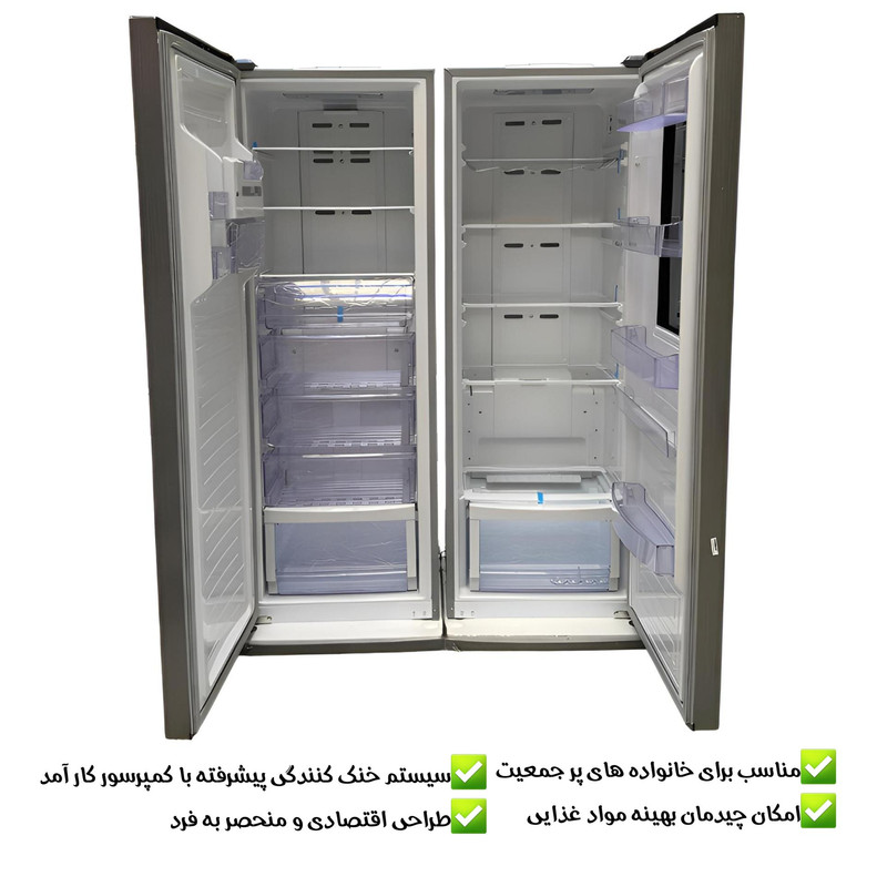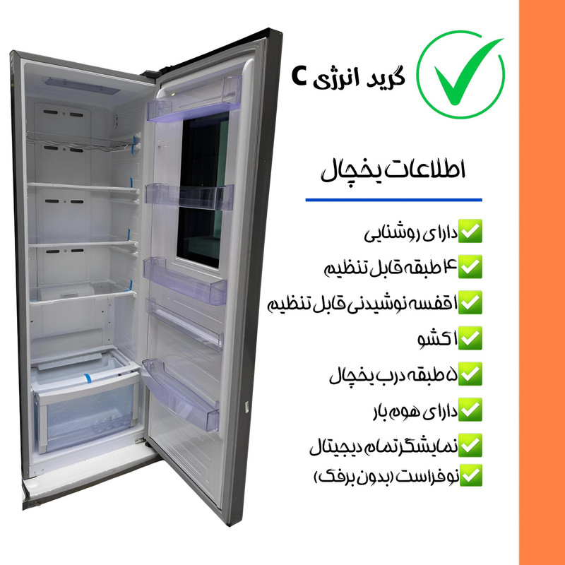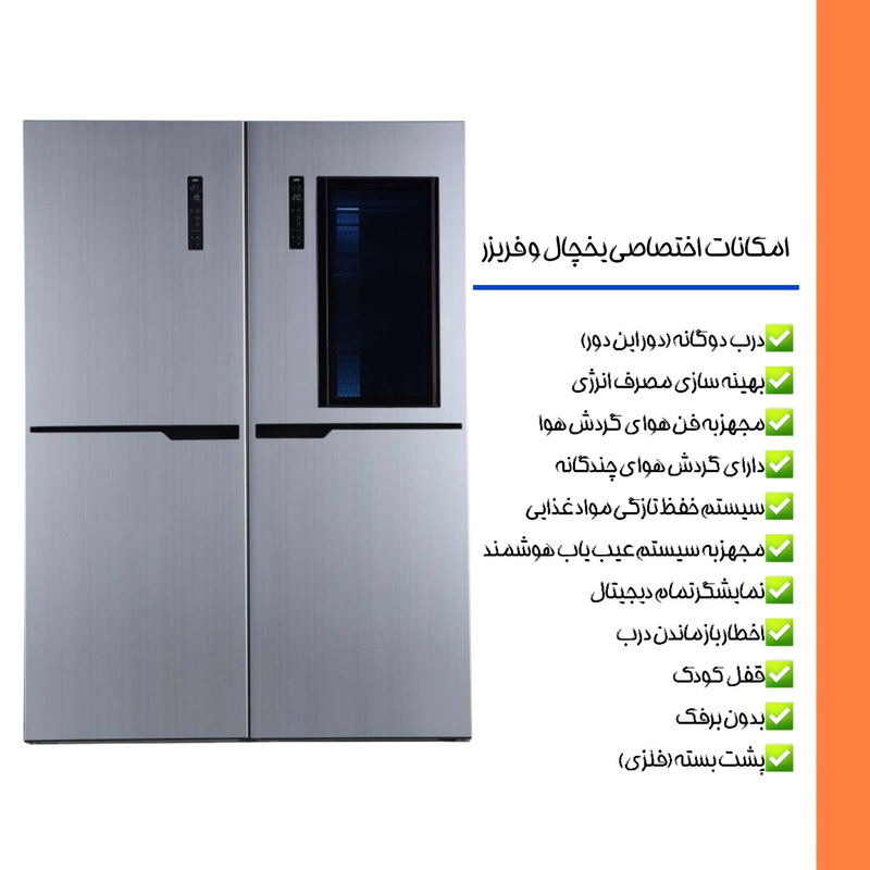 سایر ویژگیها | مجهز به سیستم سرمایش بدون برفک، مجهز به سیستم توزیع هوا به صورت یکسان، مجهز به عملکرد سرد کردن سریع در یخچال و انجماد سریع در فریزر، مجهز به قفل کودک جهت پنل کنترل |