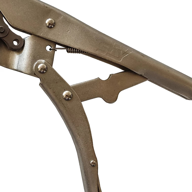 انبر قفلی زنجیری اسکای سایز 10 اینچ یکی از حرفهایترین و با دوامترین انبر قفلیهای موجود در بازار است. این مدل انبر قفلی مناسب برای محکم گرفتن اجسام نا متعارف هست. این انبرقفلی دارای زنجیر جهت گرفتن اجسام در اشکال و اندازههای مختلف هست. این زنجیر دارای استحکام بالا و مقاوم در برابر نیروهای اعمالی کششی و گشتاوری است. این انبرقفلی دارای فک مقاوم و سخت کاری شده هست. فکها از جنس فولاد ابزاری و به روش آهنگری (فورج) تولید و کاملاً سختکاری شدهاند. این انبرقفلی از مکانیزم قفل مناسب جهت اعمال فشارهای بالا برای گرفتن قطعات برخوردار است. بدنه این انبر از جنس فولاد کربنی است. این انبر قفلی دارای ضامن آزاد کننده سریع است تا به راحتی بتوان با این ضامن، انبر را از حالت قفل خارج نمود.