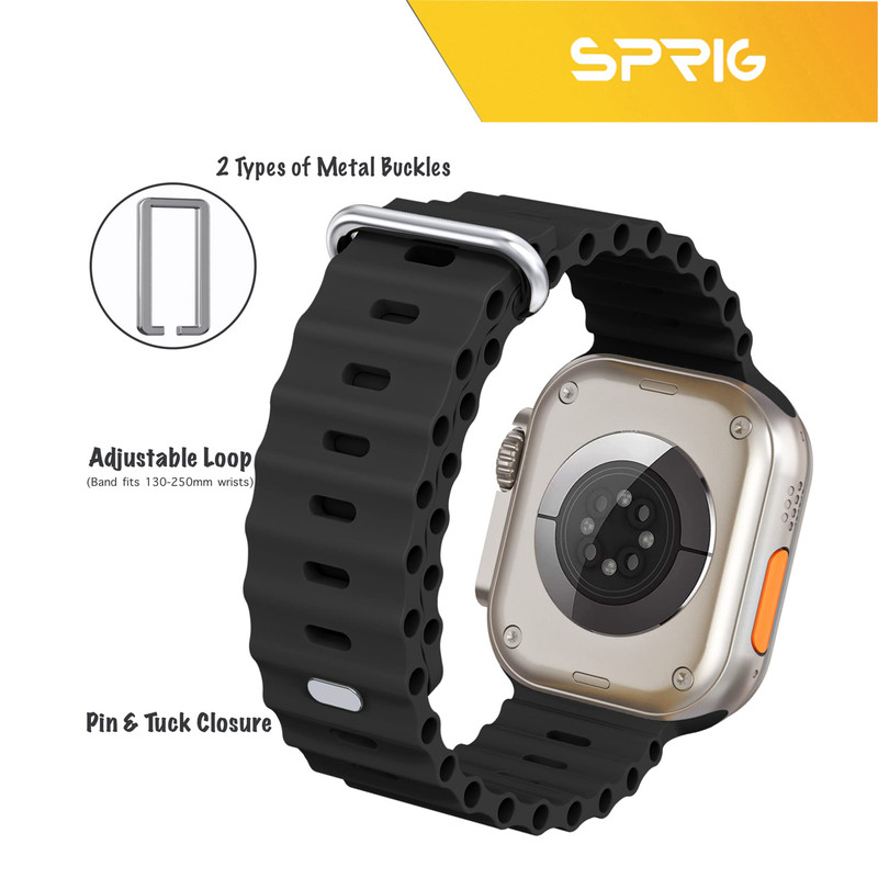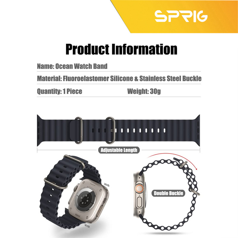 بند اسپریگ مدل Ocean سبک وزن، بادوام و قابل تنظیم، به طور یکپارچه از دو لایه پارچه، بدون دوخت بافته شده می باشد. از قلابهای تیتانیومی مقاوم در برابر خوردگی و بدون زنگ زدگی برای اتصال ایمن استفاده می کند. نوار ساخته شده از جنس سیلیکون سازگار با پوست، قابل تنفس، مقاوم در برابر عرق و مقاوم در برابر آب میباشد. همچنین با قلاب تیتانیوم ، سبک وزن میباشد. مناسب برای کوهنوردی، پیاده روی، دویدن، صخره نوردی، دویدن، دوچرخه سواری و سایر ورزش های ماجراجویی در فضای باز میباشد. بندهای طراحی شده برای ساعت اپل دارای یک هوک فلزی قابل تنظیم برای انعطاف پذیری و ایمن کردن بند شماست.