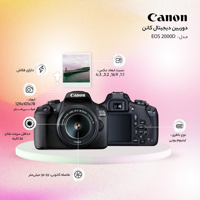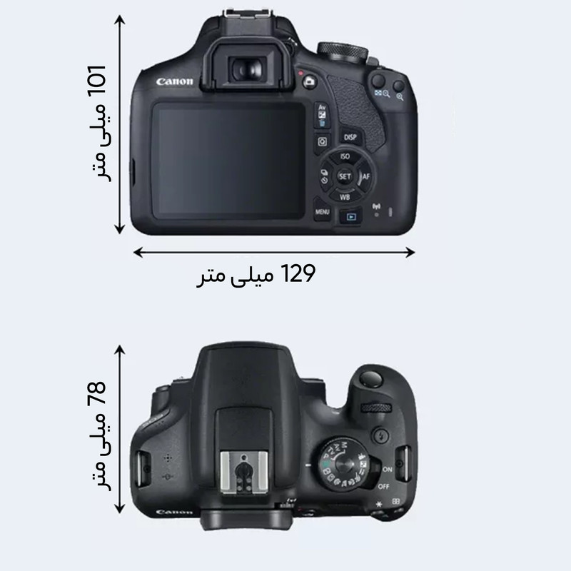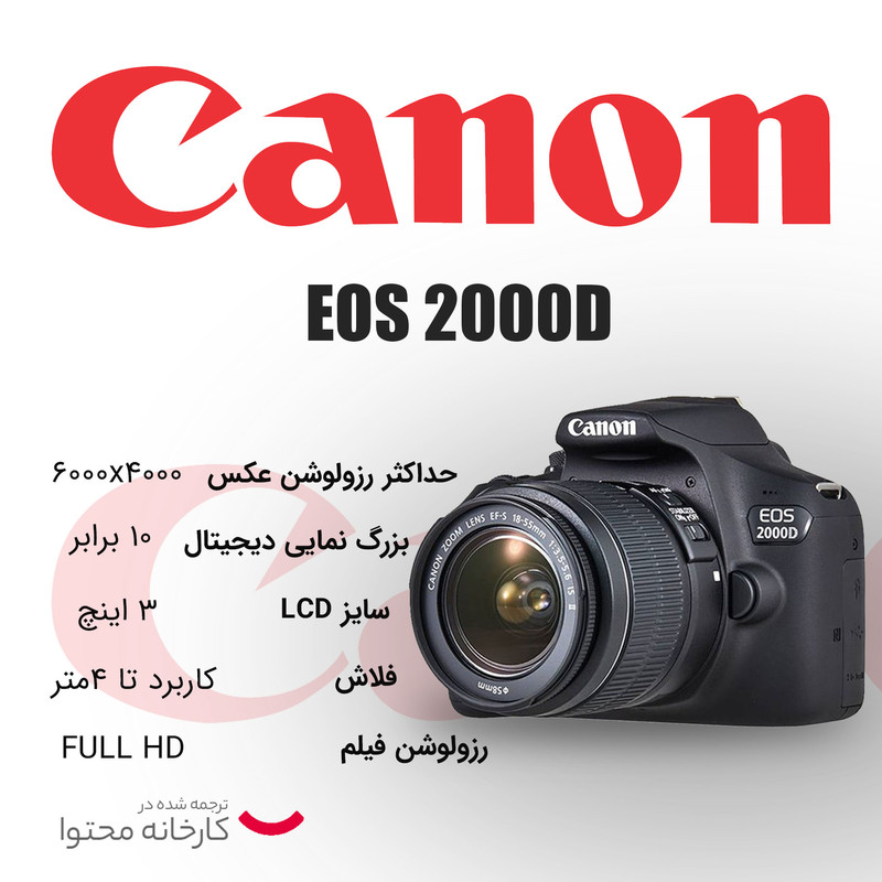دوربین کانن EOS 2000D با حسگر CMOS، پردازشگر DIGIC 4+، حداکثر رزولوشن 6000 × 4000، دقت موثر حسگر 24.1 مگاپیکسل، نسبت ابعاد عکس 3:2 - 4:3 - 16:9 - 1:1 همراه با فرمت غیرفشرده عکس RAW و قطع APS-C در اختیار کاربران قرار گرفته است. ایزوی تعبیه شده در دوربین کانن 2000D برابر 6400 ( 12800 ایزوی گسترش یافته) است که امکان کار در محیطهای نوری ضعیف را هم میسر کرده است و این در حالی است که پردازنده Digic 4+ این دوربین عکاسی هم باعث افزایش عملکرد بسیار بالای Scene inteligent Auto Mode جهت عکاسی هرچه آسانتر Point & Shoot بههمراه قابلیت فیلمبرداری بهصورت Full HD شده است. گفتنی است که Canon 2000D علاوه بر قدرت عکاسی پیاپی سه فریمبرثانیه دارای طول عمر باتری تا 500 شات یا بهعبارتیدیگر عملکرد یک ساعت و سی دقیقهای با رزولوشن 24.1MP هم است و این در حالی است که نمایشگر تعبیه شده در این محصول از نوع السیدی در اندازه 7.5cm با پایهای فلزی است. دوربین کانن 2000D یک محصول بسیار کاربردی برای عکاسانی است که بهدنبال یک دوربین قدرتمند با قیمت و کیفیتی معقول هستند، زیرا طراحی تکنولوژی سنسور و پردازنده قوی همراه با باز بودن دست کاربران به اتصالات وایفای و دسترسی هرچه راحتتر به کلیه تنظیمات از طریق منوی دوربین و همچنین دسترسی به شش تصویر راهنما و چند فیلتر در حالتهای دستی باعث شده است تا تمام تصاویر بهراحتی ثبت و ضبط و در شبکههای اجتماعی به اشتراک گذاشته شوند. لنز کانن مدل EF-S 18-55mm f/3.5-5.6 III گزینهای مطلوب جهت دوربینهایی با دهانه EF در فاصلهکانونی 18-55mm است که با تغییر فاصله کانونی 28.8-88mm قابلیت نصب روی دوربینهای APS-C را هم دارا هستند. بهطورکلی این لنز عکاسی علاوهبر دیافراگم حداکثری f/3.5-f/38 برای کنترل عمق میدان دارای دیافراگم شش تیغهای جهت ایجاد بوکههای زیبا برای پسزمینه است که بهدلیل وجود یک عدسی aspherical بهمنظور کاهش بازتابندههای نوری شاهد تصویری ایدهآل با کیفیتی بالا در خروجی کار میشوید. گفتنی است که تعبیه سیستم فوکوس خودکار با امکان تعویض سریع از خودکار به دستی از دیگر قابلیتهای لنز کانن 18-55 میلیمتر است. حداکثر سرعت فیلمبرداری این دوربین 30 فریمبرثانیه است.